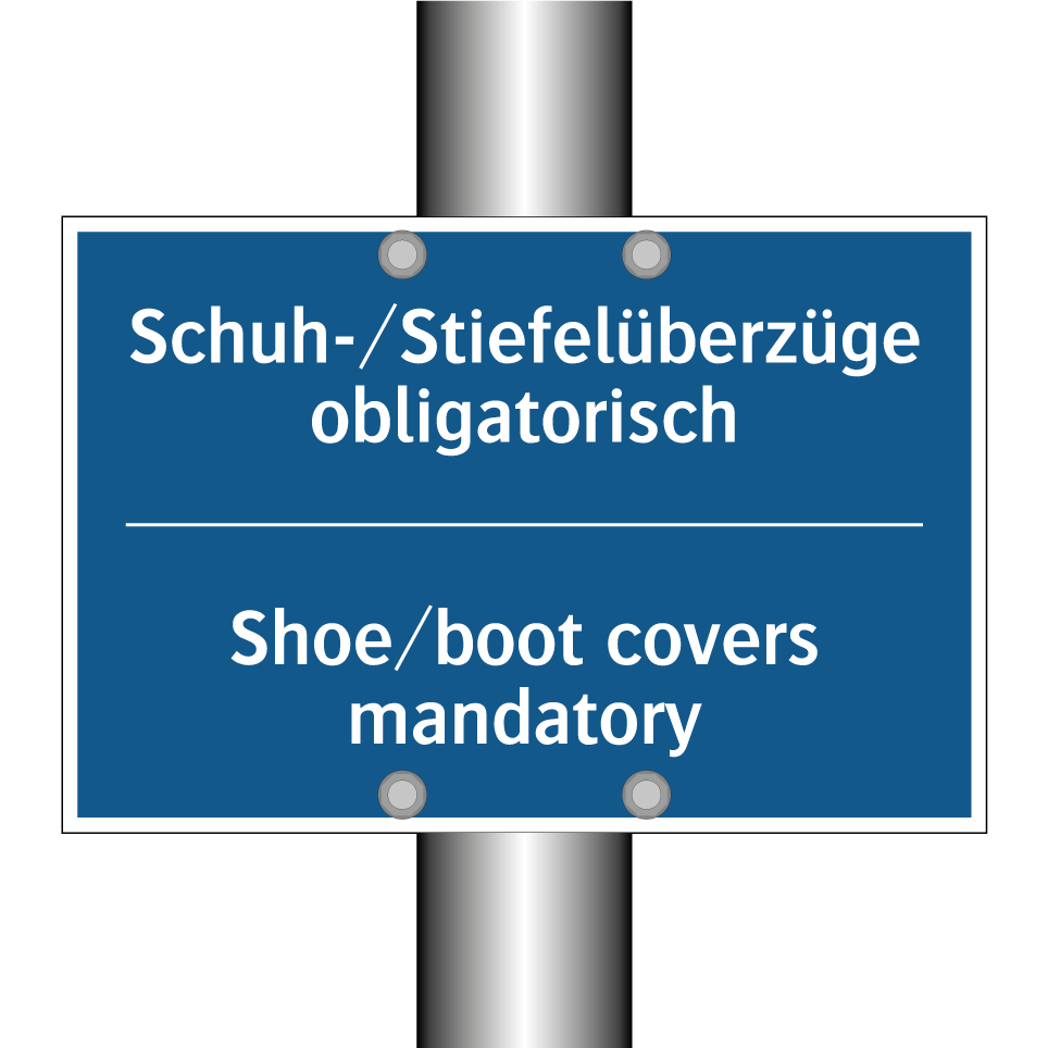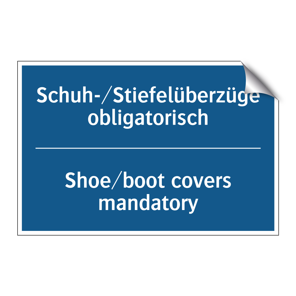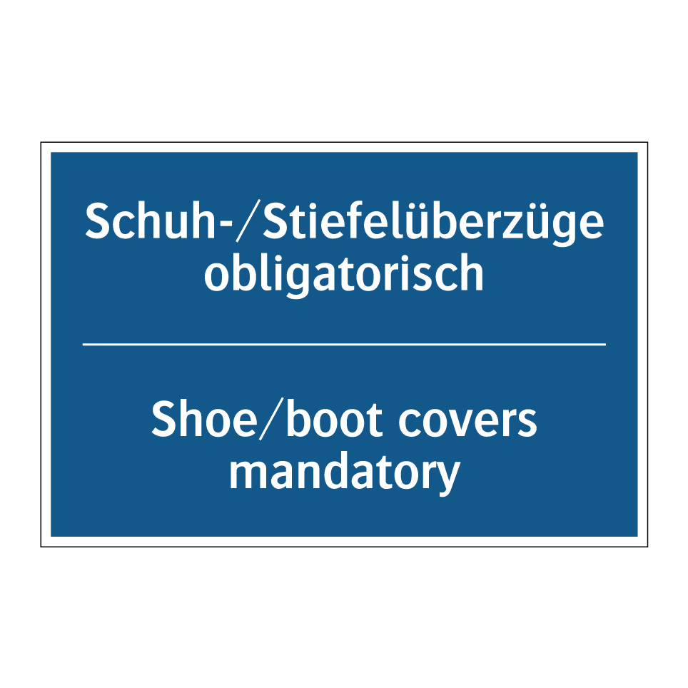 Zweisprachiges Verbotsschild mit deutschem Text Schuh-/Stiefelüberzüge obligatorisch und englischem Text Shoe/boot covers mandatory