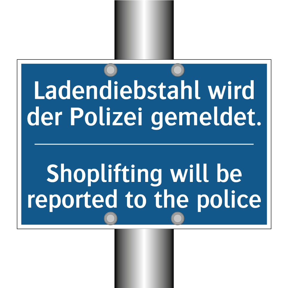 Zweisprachiges Verbotsschild mit deutschem Text Ladendiebstahl wird der Polizei gemeldet. und englischem Text Shoplifting will be reported to the police