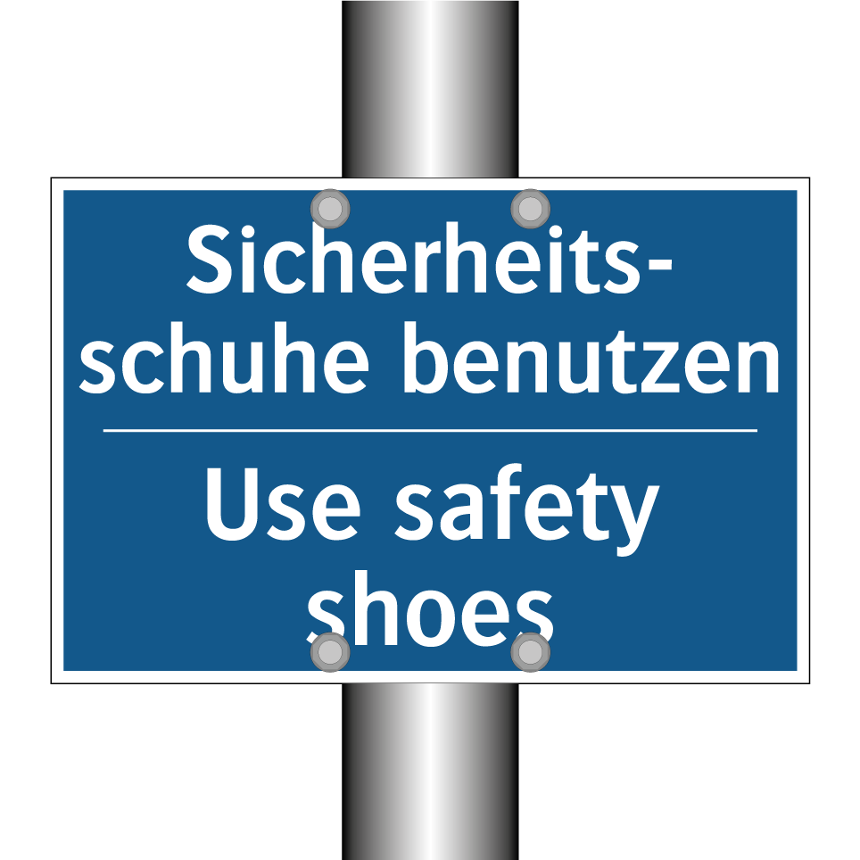 Zweisprachiges Verbotsschild mit deutschem Text Sicherheits- schuhe benutzen und englischem Text Use safety shoes