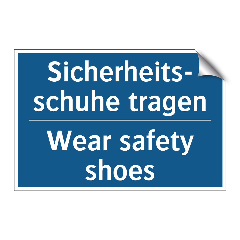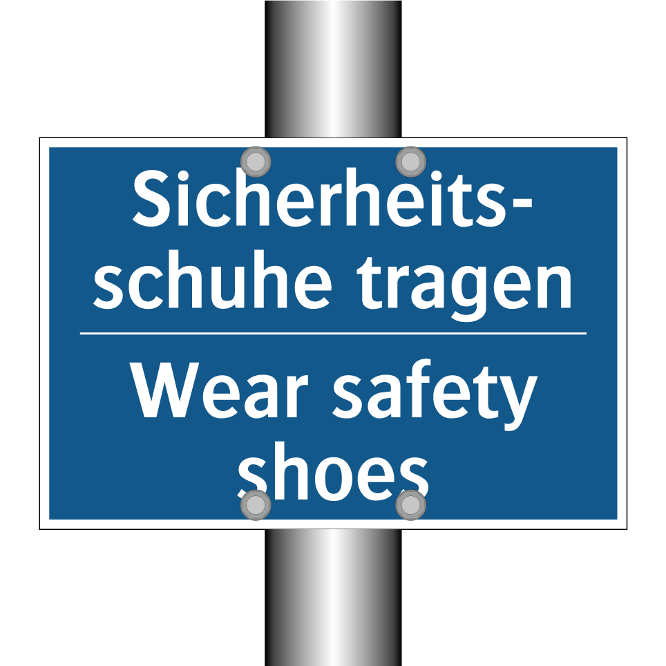 Zweisprachiges Verbotsschild mit deutschem Text Sicherheits- schuhe tragen und englischem Text Wear safety shoes