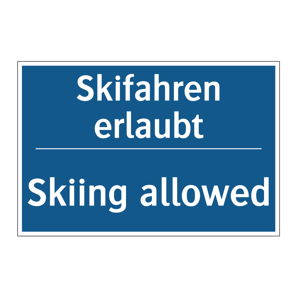 Zweisprachiges Verbotsschild mit deutschem Text Skifahren erlaubt und englischem Text Skiing allowed