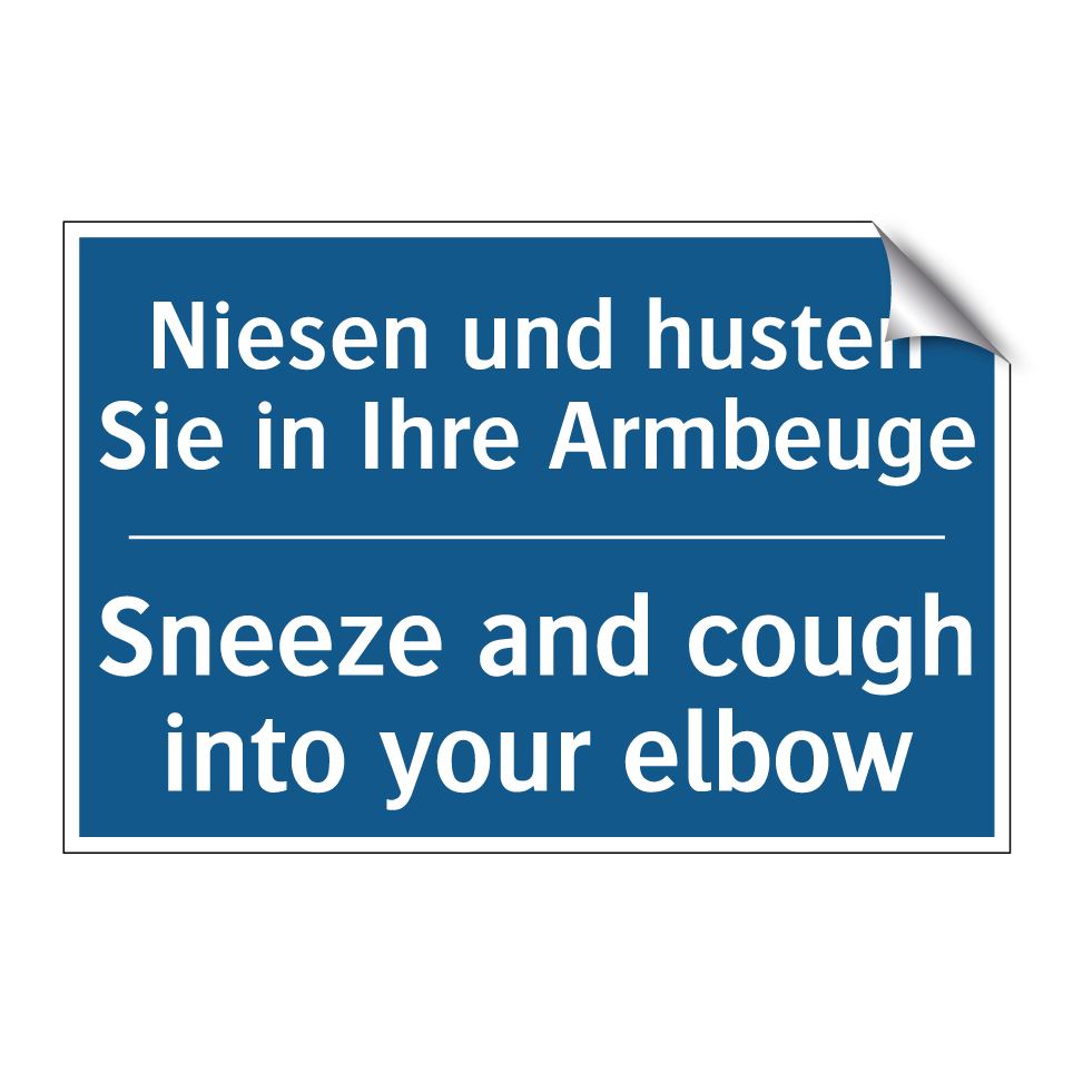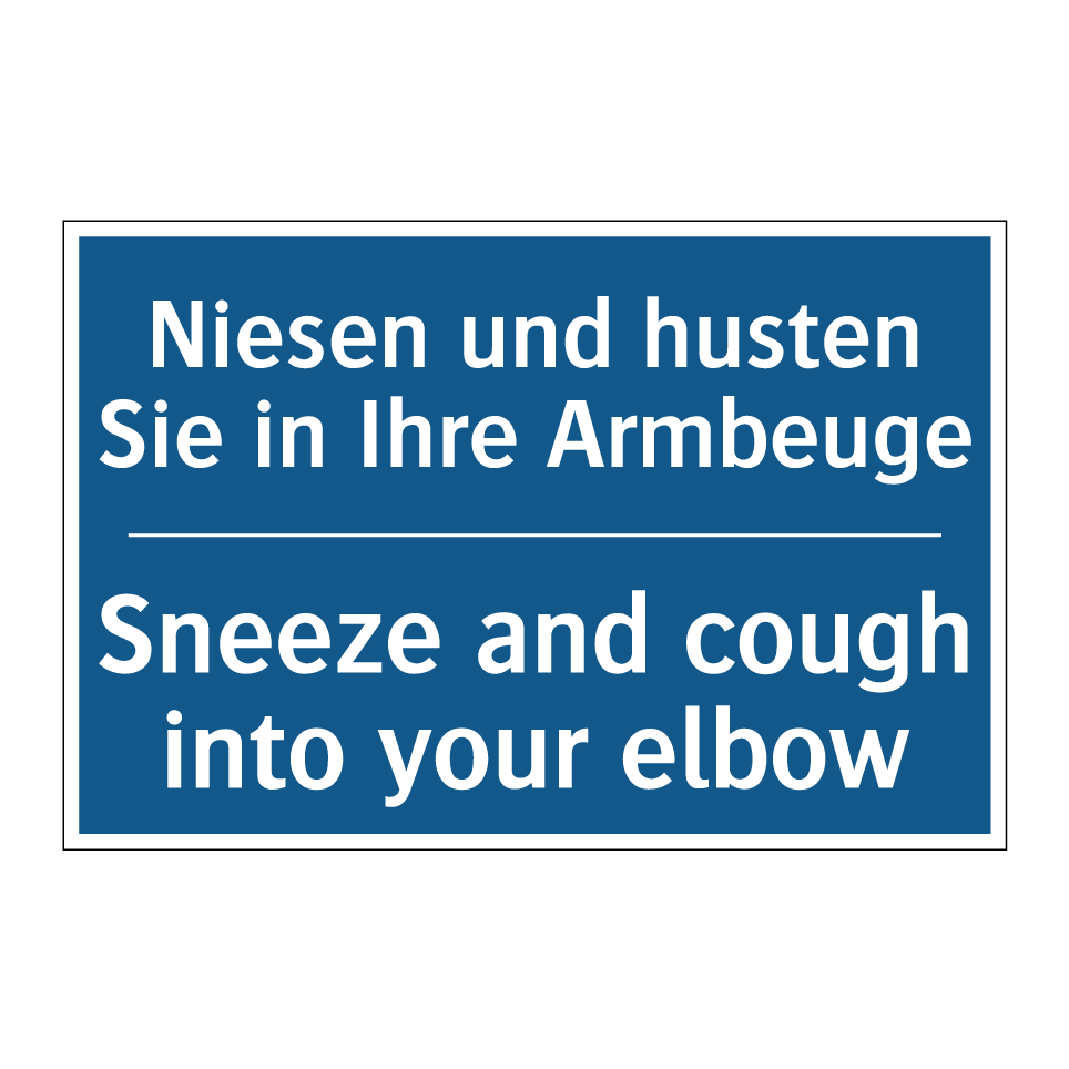 Zweisprachiges Verbotsschild mit deutschem Text Niesen und husten Sie in Ihre Armbeuge und englischem Text Sneeze and cough into your elbow