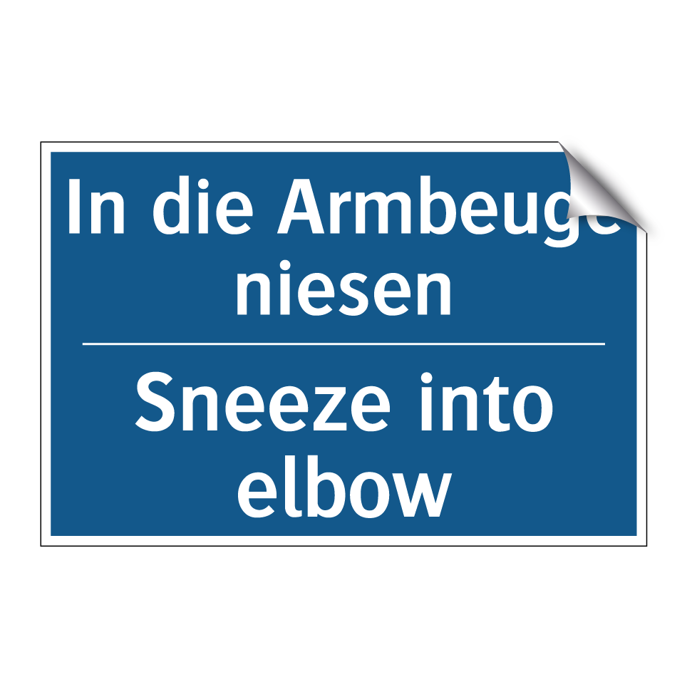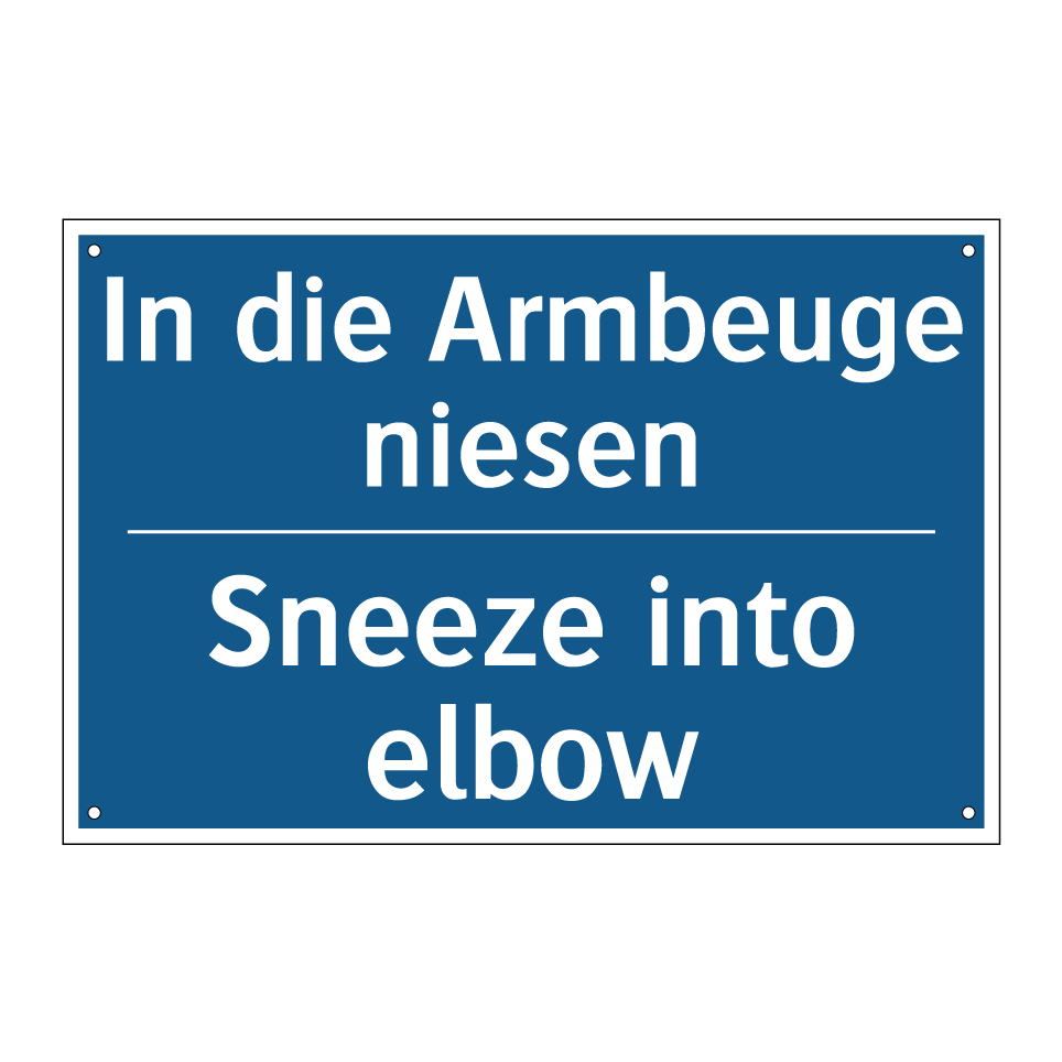 Zweisprachiges Verbotsschild mit deutschem Text In die Armbeuge niesen und englischem Text Sneeze into elbow