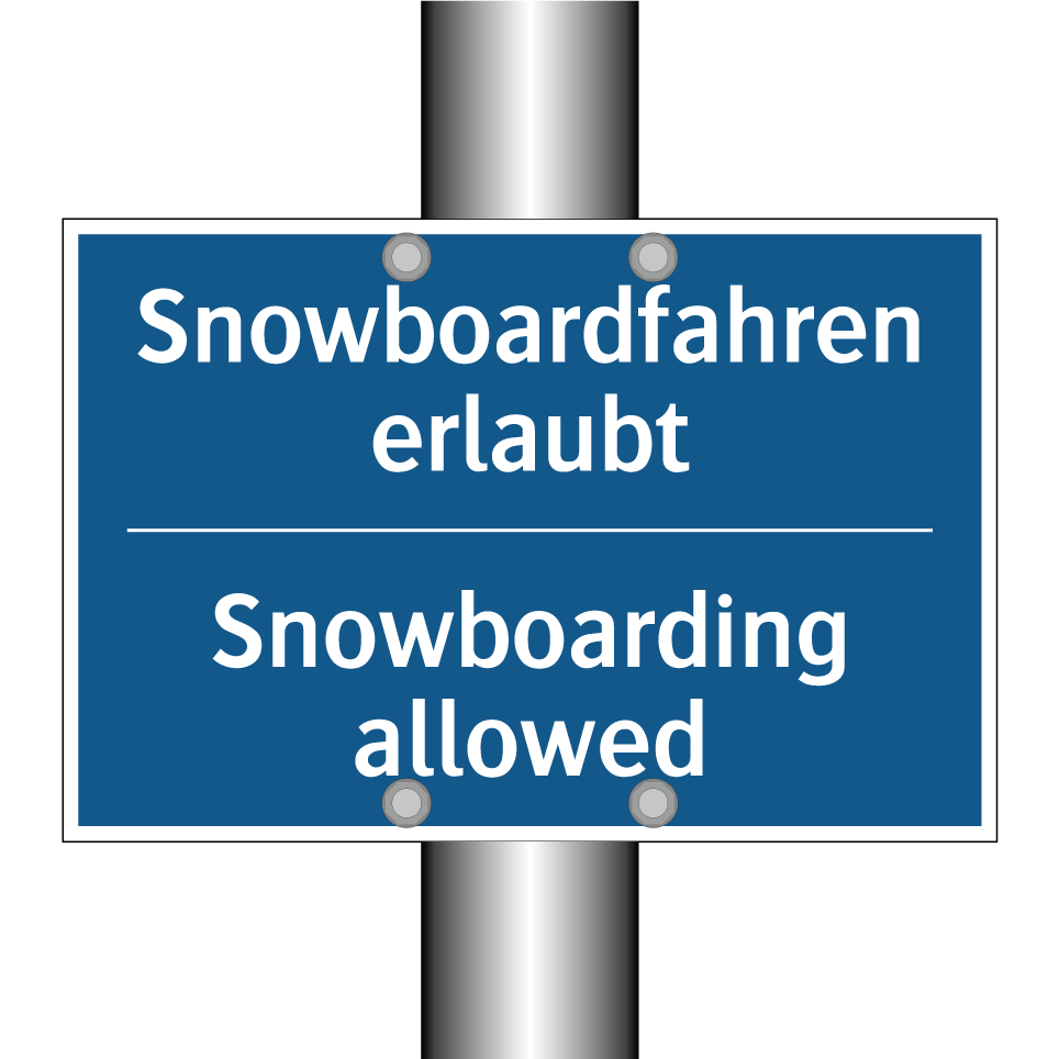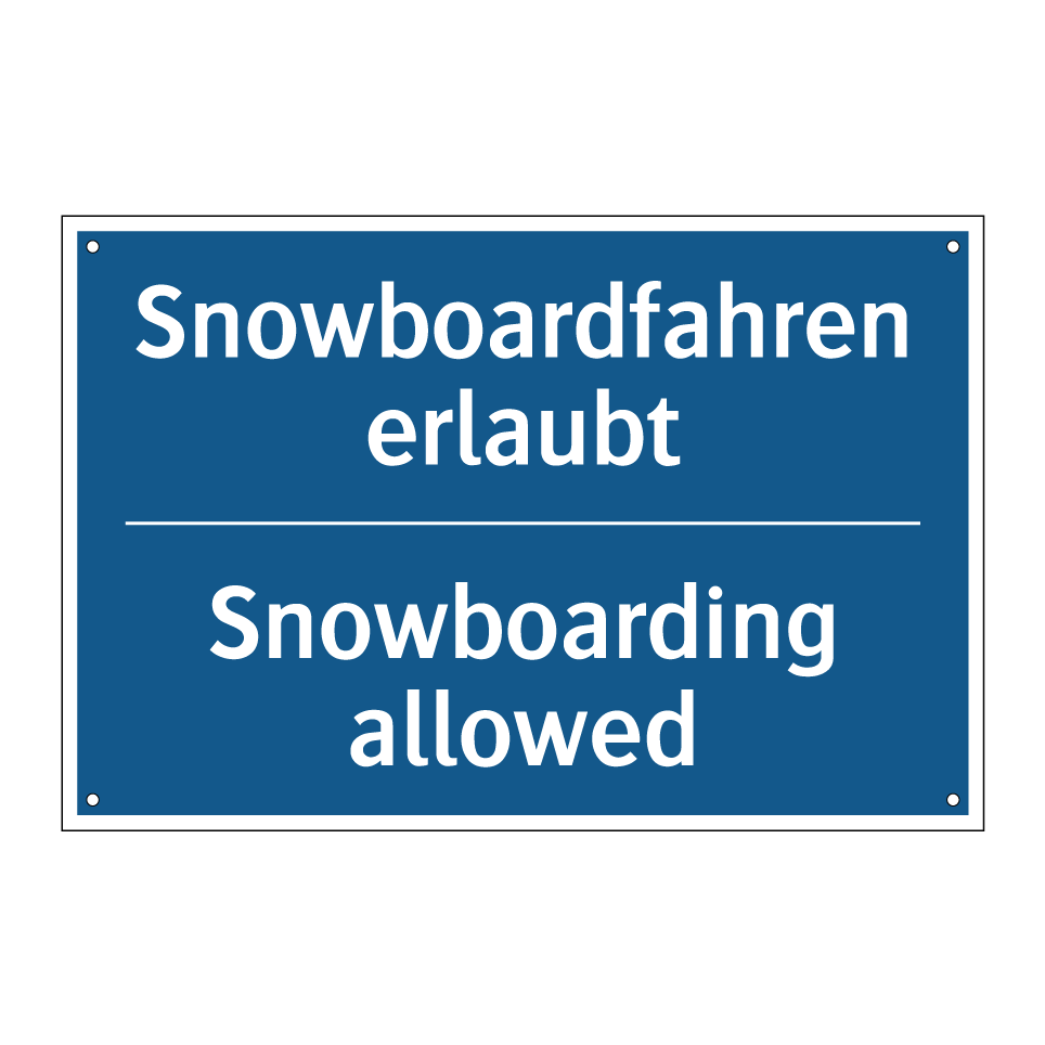 Zweisprachiges Verbotsschild mit deutschem Text Snowboardfahren erlaubt und englischem Text Snowboarding allowed