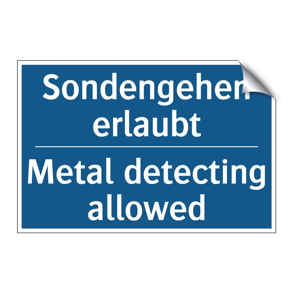 Zweisprachiges Verbotsschild mit deutschem Text Sondengehen erlaubt und englischem Text Metal detecting allowed