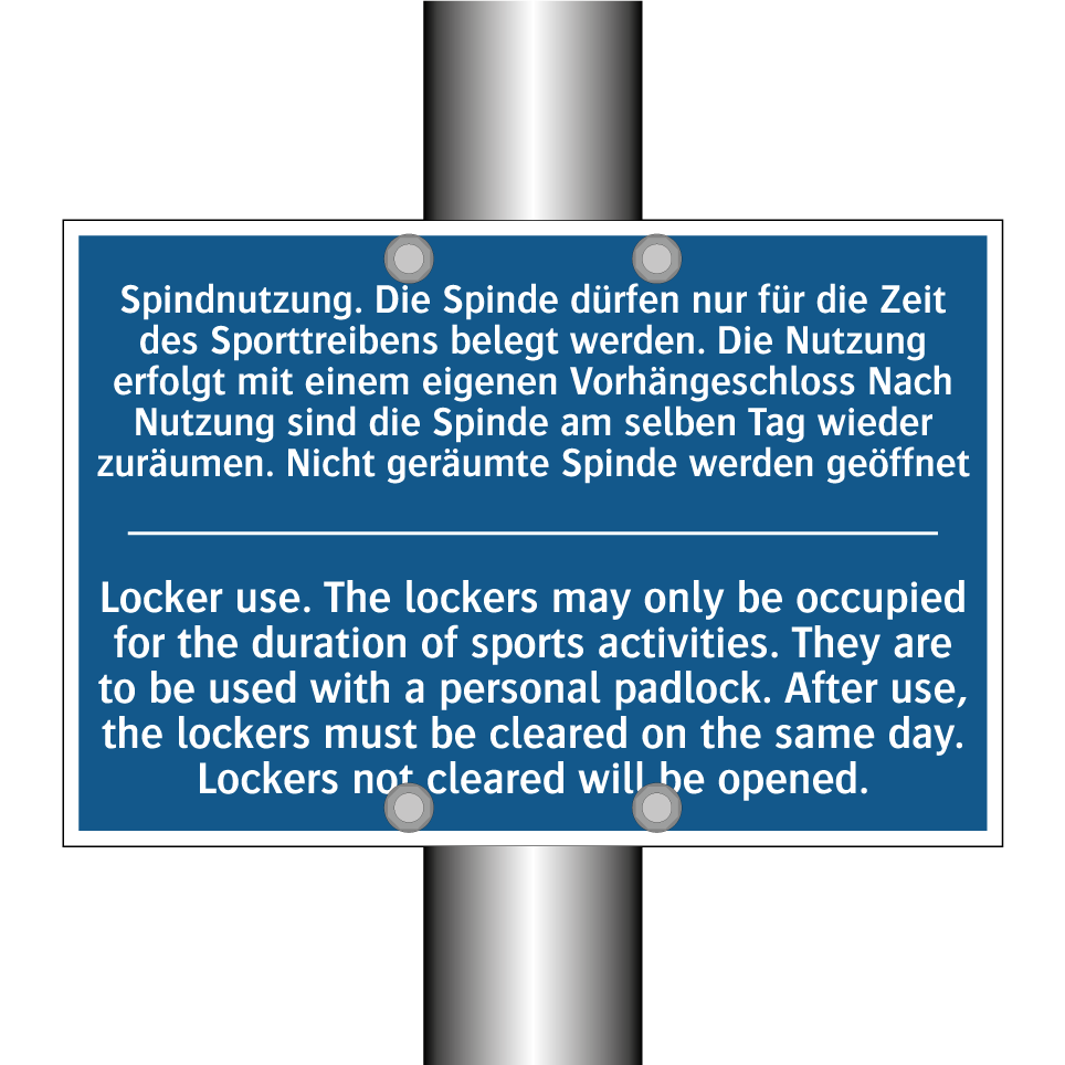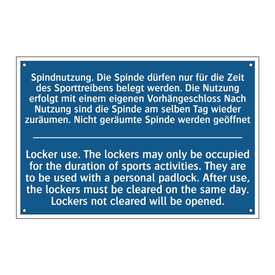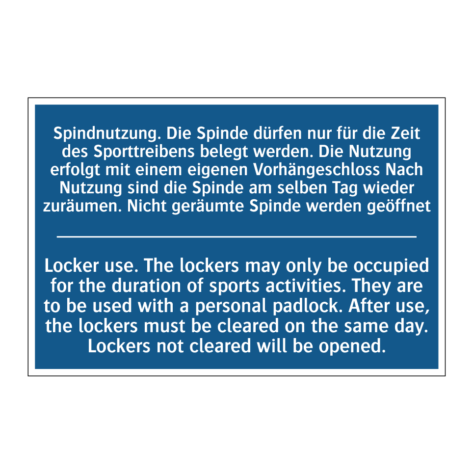 Zweisprachiges Verbotsschild mit deutschem Text Spindnutzung. Die Spinde dürfen nur für die Zeit des Sporttreibens belegt werden. Die Nutzung erfolgt mit einem eigenen Vorhängeschloss Nach Nutzung sind die Spinde am selben Tag wieder zuräumen. Nicht geräumte Spinde werden geöffnet und englischem Text Locker use. The lockers may only be occupied for the duration of sports activities. They are to be used with a personal padlock. After use, the lockers must be cleared on the same day. Lockers not cleared will be opened.