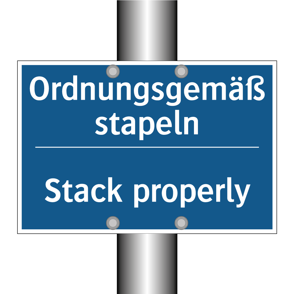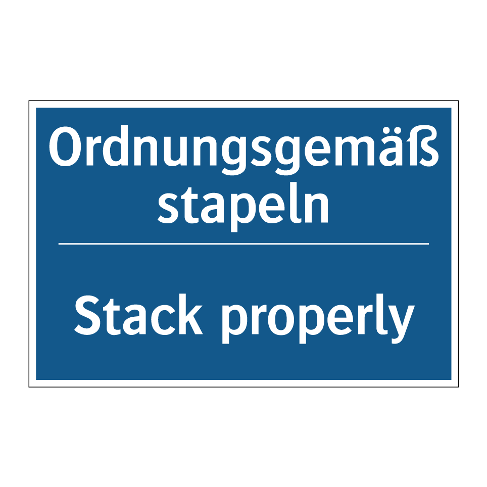 Zweisprachiges Verbotsschild mit deutschem Text Ordnungsgemäß stapeln und englischem Text Stack properly