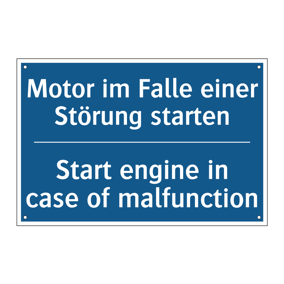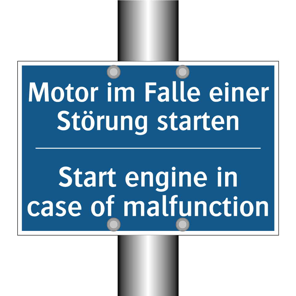 Zweisprachiges Verbotsschild mit deutschem Text Motor im Falle einer Störung starten und englischem Text Start engine in case of malfunction
