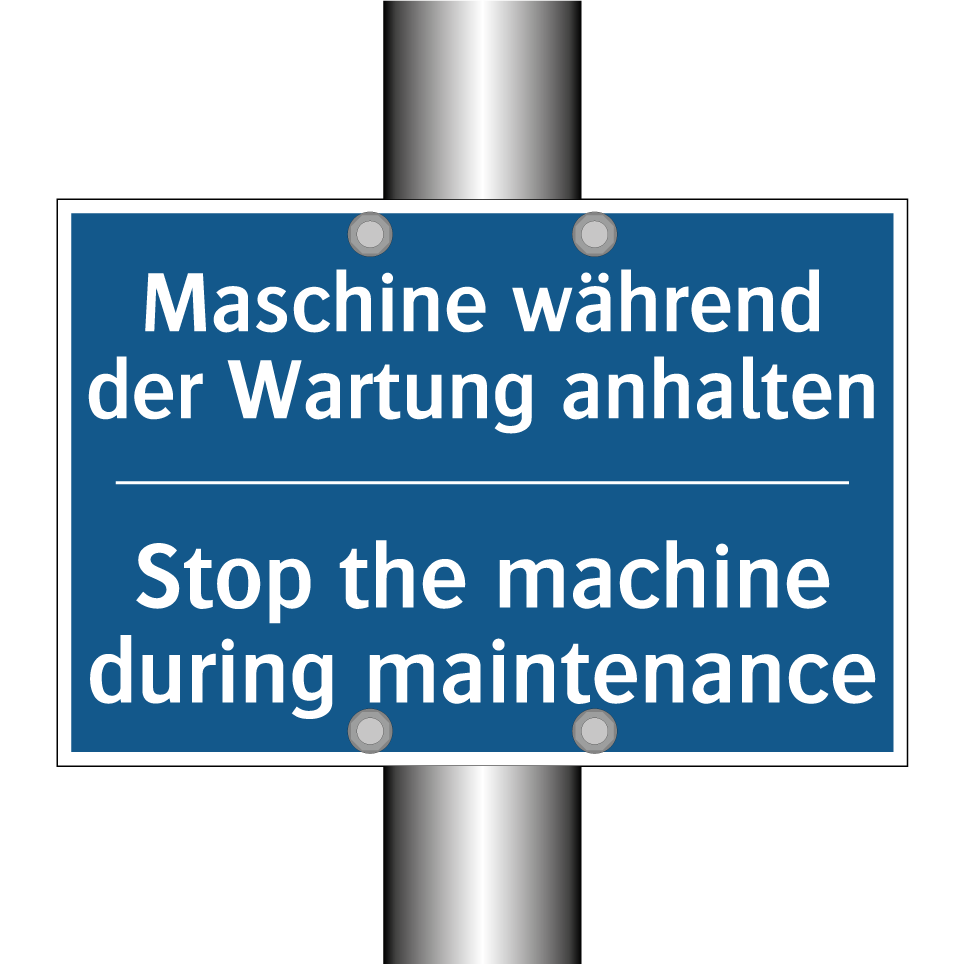 Zweisprachiges Verbotsschild mit deutschem Text Maschine während der Wartung anhalten und englischem Text Stop the machine during maintenance