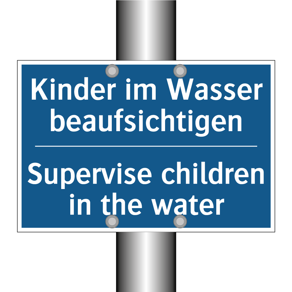 Zweisprachiges Verbotsschild mit deutschem Text Kinder im Wasser beaufsichtigen und englischem Text Supervise children in the water