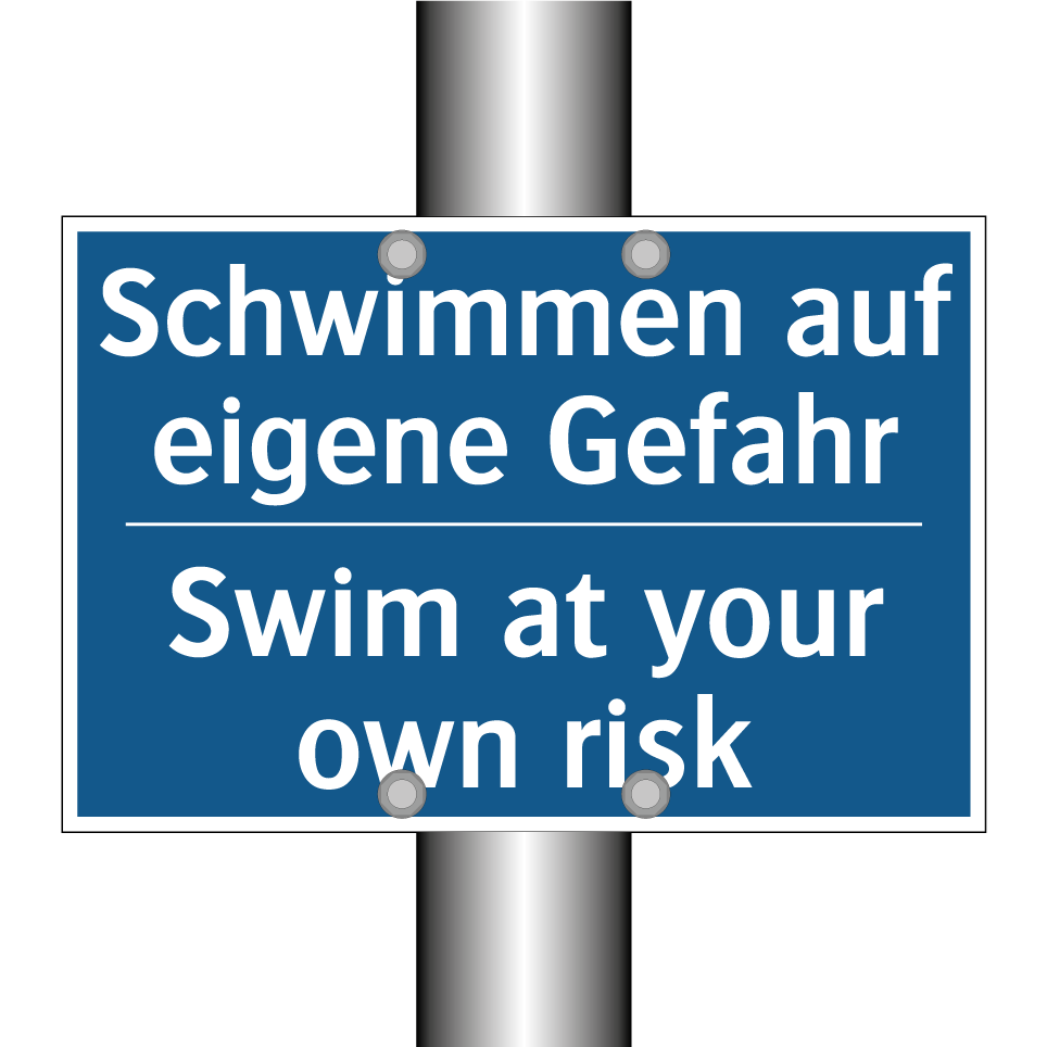Zweisprachiges Verbotsschild mit deutschem Text Schwimmen auf eigene Gefahr und englischem Text Swim at your own risk