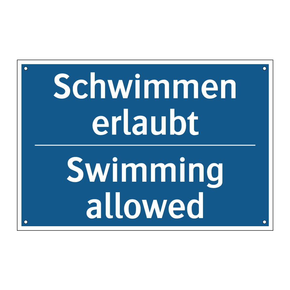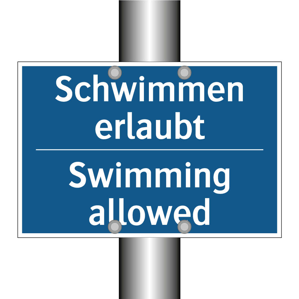 Zweisprachiges Verbotsschild mit deutschem Text Schwimmen erlaubt und englischem Text Swimming allowed