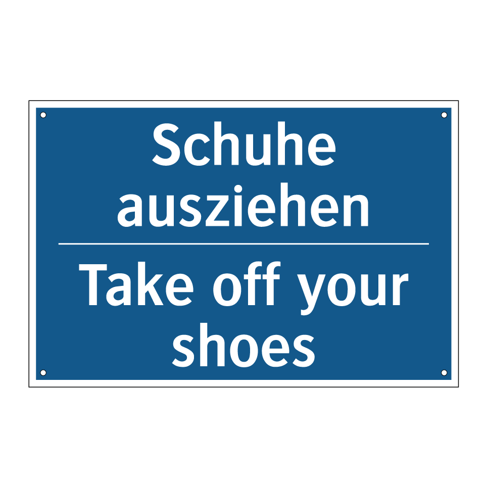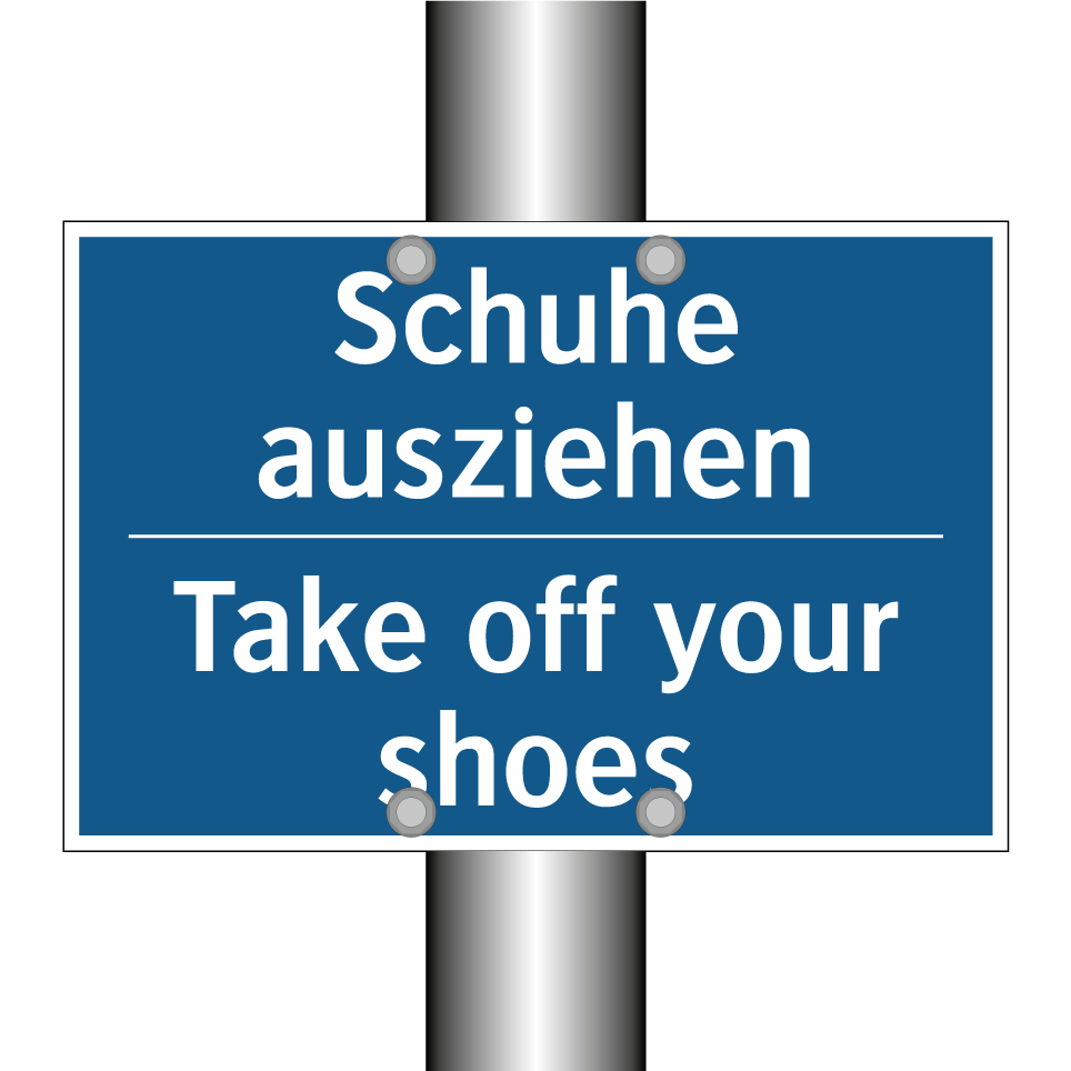 Zweisprachiges Verbotsschild mit deutschem Text Schuhe ausziehen und englischem Text Take off your shoes
