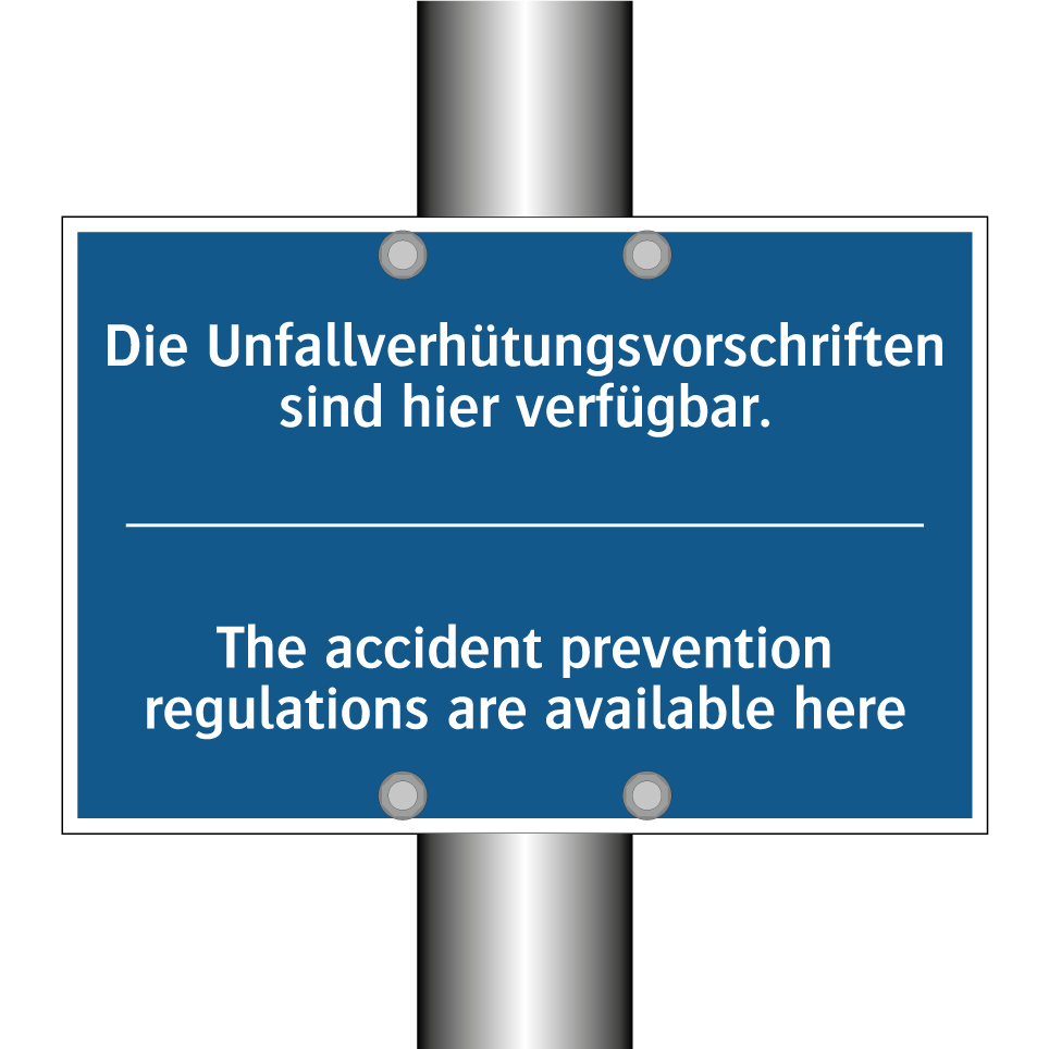 Zweisprachiges Verbotsschild mit deutschem Text Die Unfallverhütungsvorschriften sind hier verfügbar. und englischem Text The accident prevention regulations are available here
