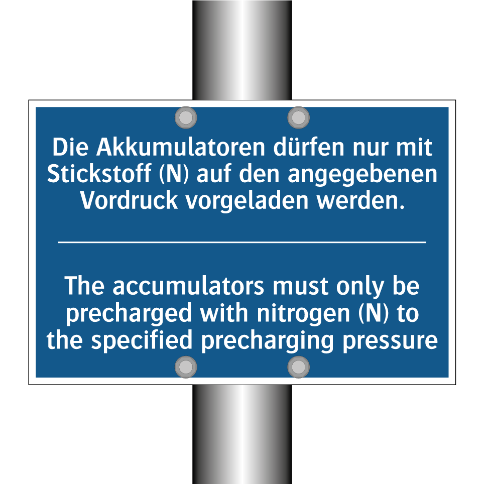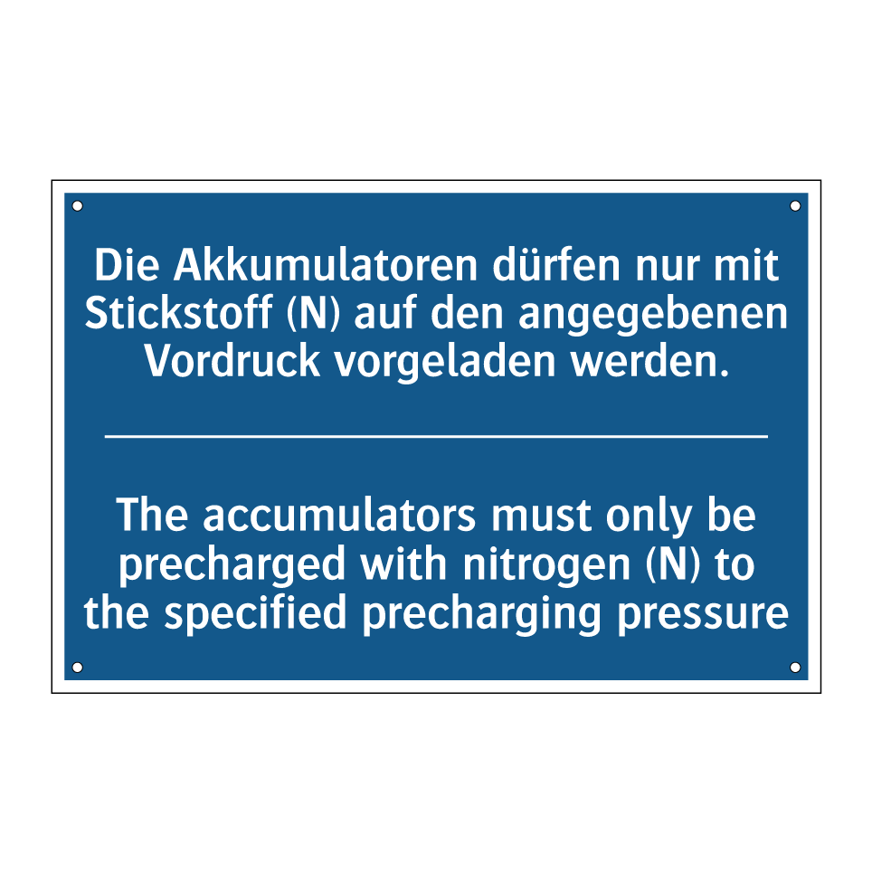 Zweisprachiges Verbotsschild mit deutschem Text Die Akkumulatoren dürfen nur mit Stickstoff (N) auf den angegebenen Vordruck vorgeladen werden. und englischem Text The accumulators must only be precharged with nitrogen (N) to the specified precharging pressure
