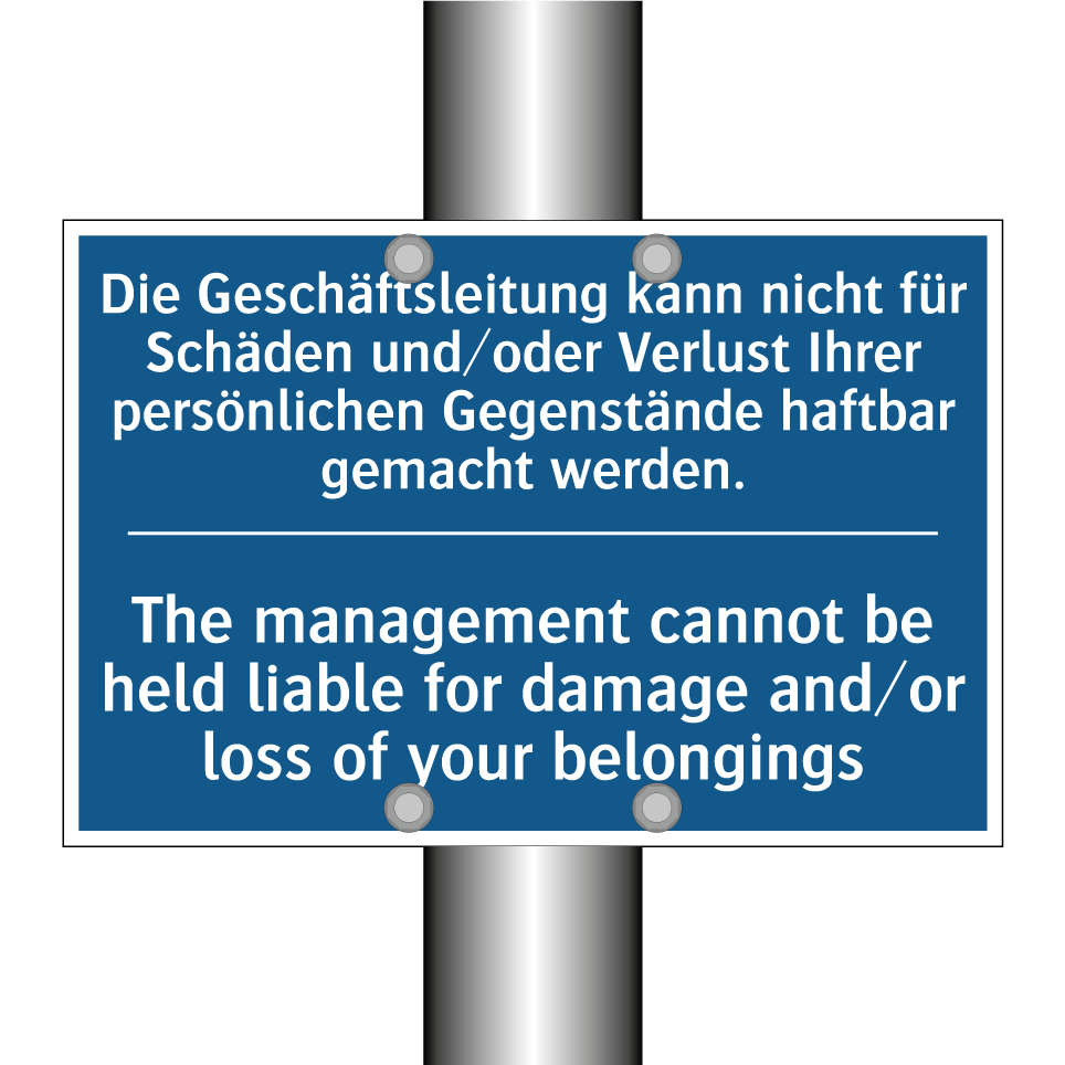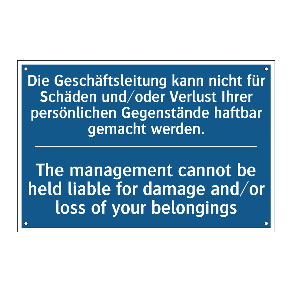 Zweisprachiges Verbotsschild mit deutschem Text Die Geschäftsleitung kann nicht für Schäden und/oder Verlust Ihrer persönlichen Gegenstände haftbar gemacht werden. und englischem Text The management cannot be held liable for damage and/or loss of your belongings