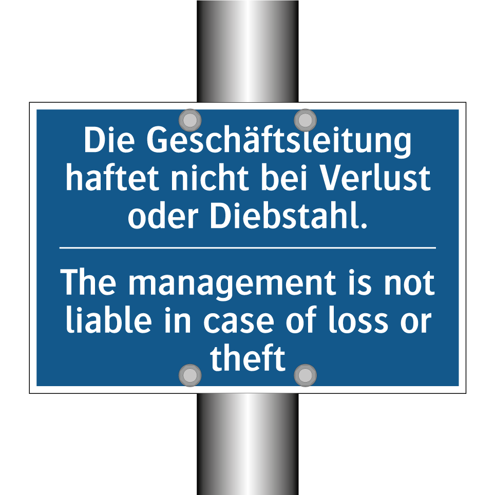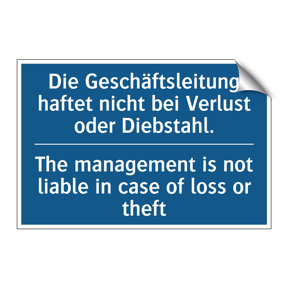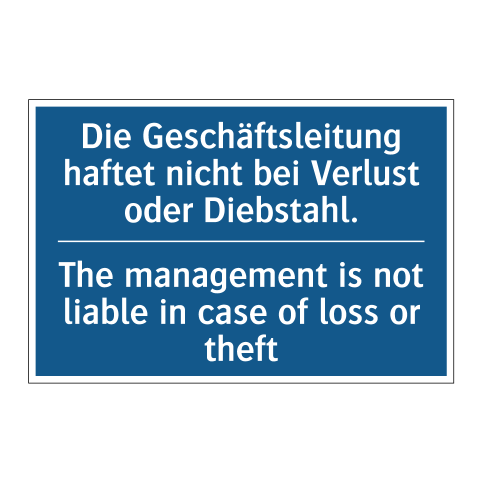 Zweisprachiges Verbotsschild mit deutschem Text Die Geschäftsleitung haftet nicht bei Verlust oder Diebstahl. und englischem Text The management is not liable in case of loss or theft