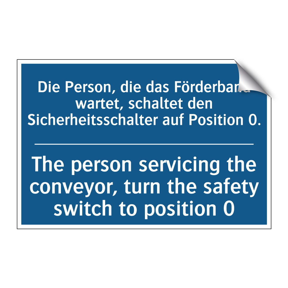 Zweisprachiges Verbotsschild mit deutschem Text Die Person, die das Förderband wartet, schaltet den Sicherheitsschalter auf Position 0. und englischem Text The person servicing the conveyor, turn the safety switch to position 0