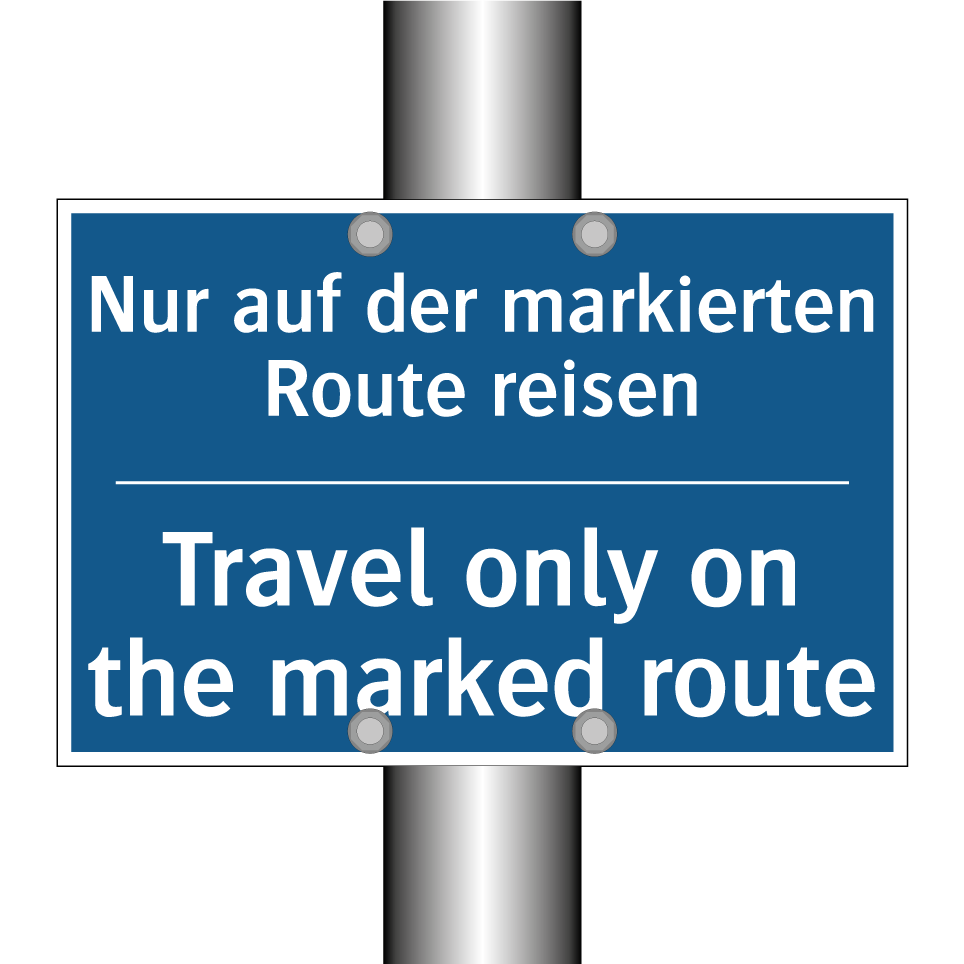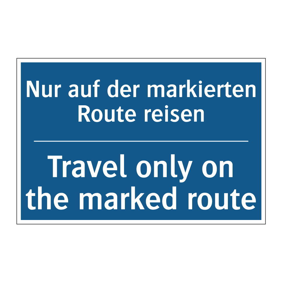 Zweisprachiges Verbotsschild mit deutschem Text Nur auf der markierten Route reisen und englischem Text Travel only on the marked route