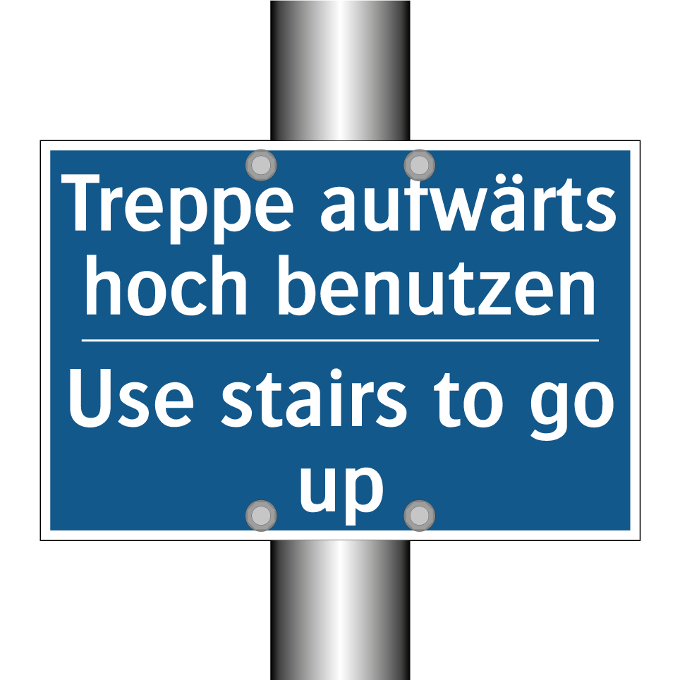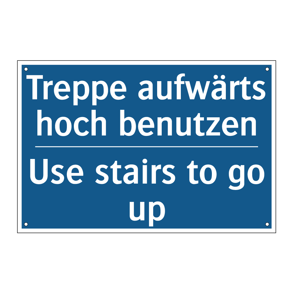 Zweisprachiges Verbotsschild mit deutschem Text Treppe aufwärts hoch benutzen und englischem Text Use stairs to go up