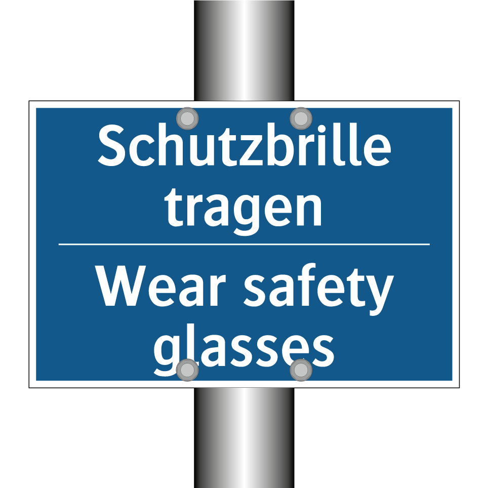 Zweisprachiges Verbotsschild mit deutschem Text Schutzbrille tragen und englischem Text Wear safety glasses