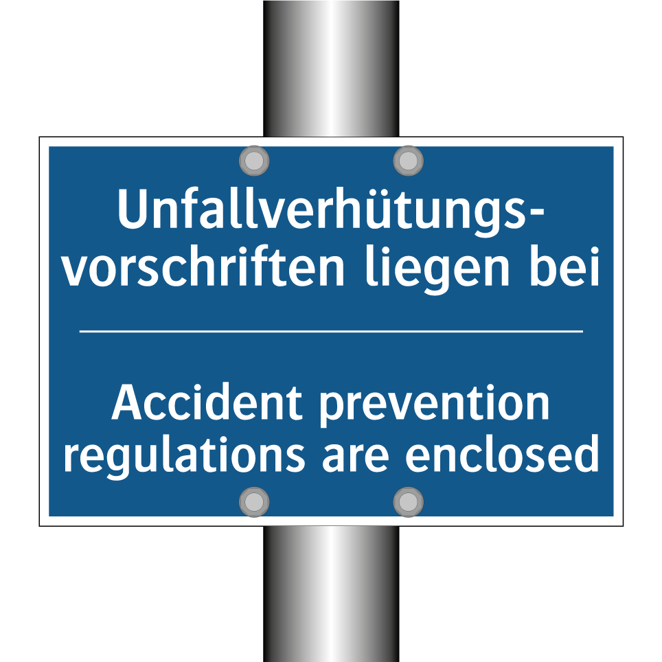 Zweisprachiges Verbotsschild mit deutschem Text Unfallverhütungs- vorschriften liegen bei und englischem Text Accident prevention regulations are enclosed