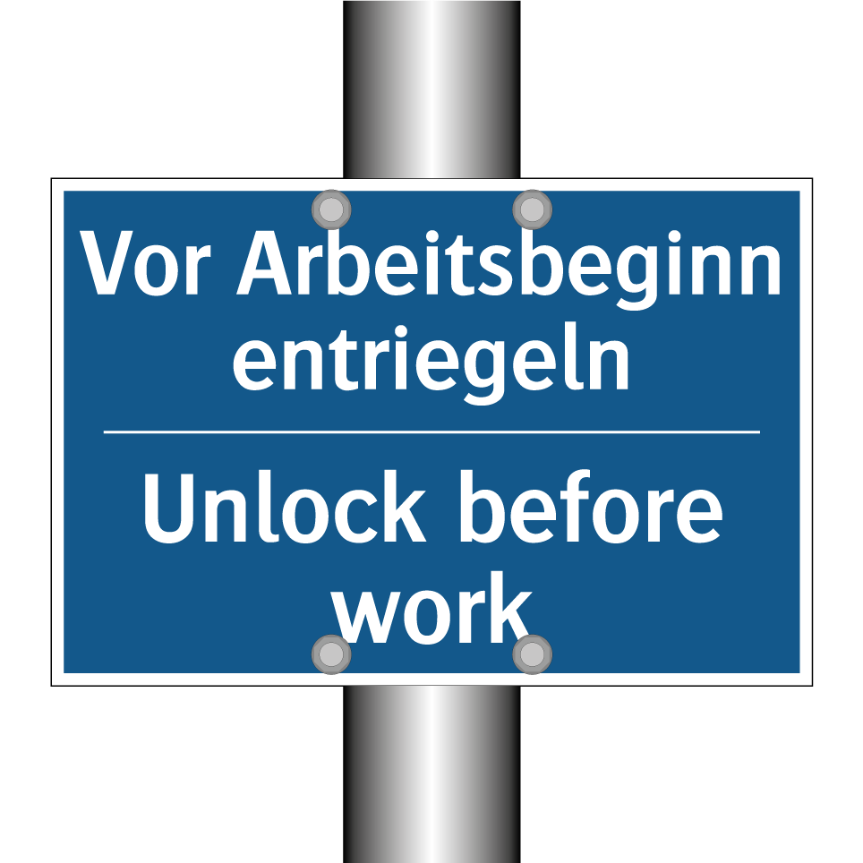 Zweisprachiges Verbotsschild mit deutschem Text Vor Arbeitsbeginn entriegeln und englischem Text Unlock before work