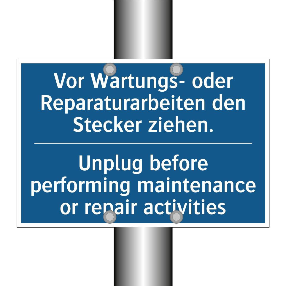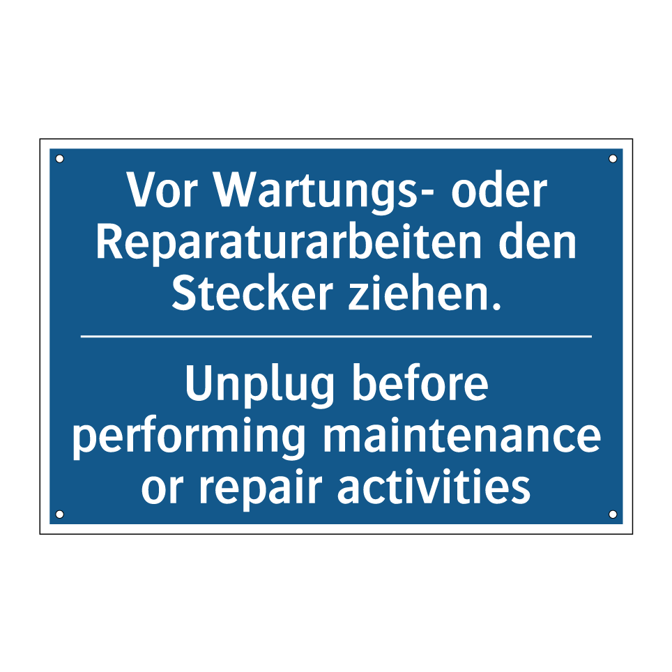 Zweisprachiges Verbotsschild mit deutschem Text Vor Wartungs- oder Reparaturarbeiten den Stecker ziehen. und englischem Text Unplug before performing maintenance or repair activities