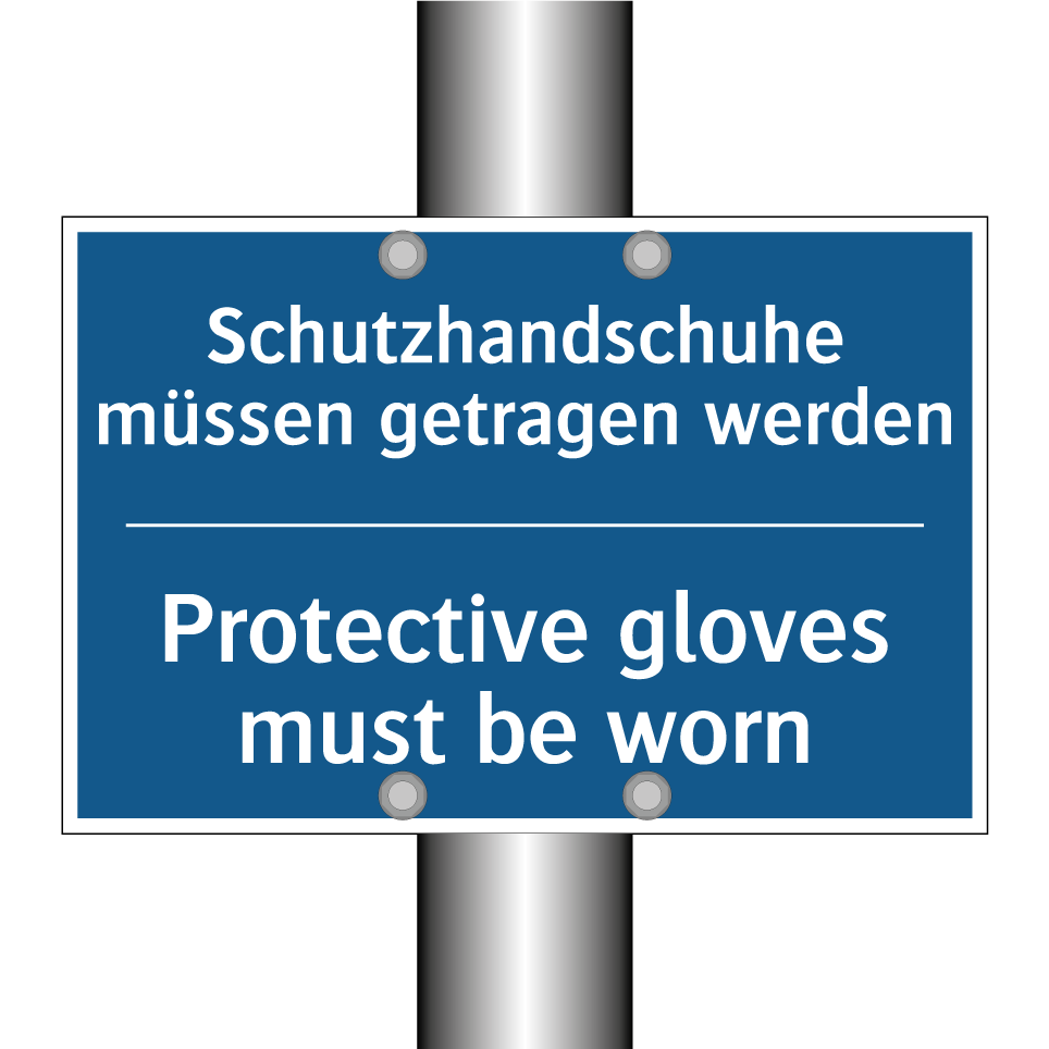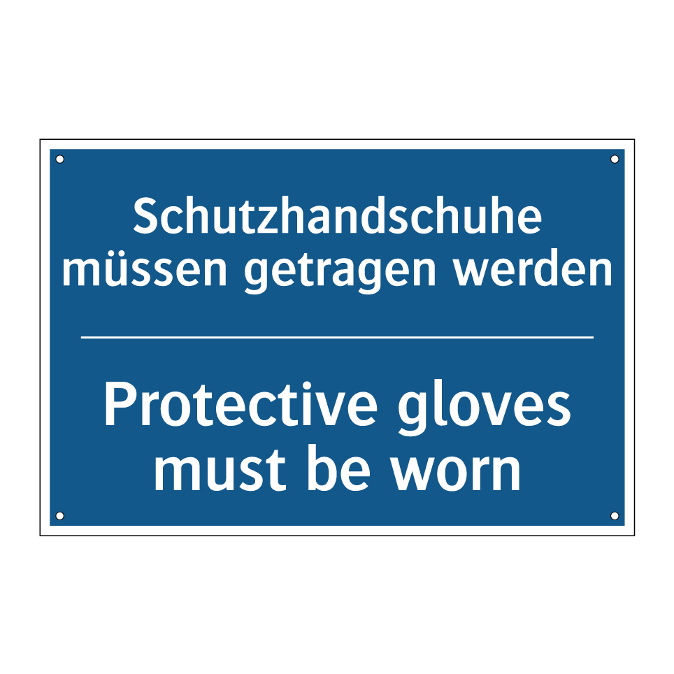 Zweisprachiges Verbotsschild mit deutschem Text Schutzhandschuhe müssen getragen werden und englischem Text Protective gloves must be worn