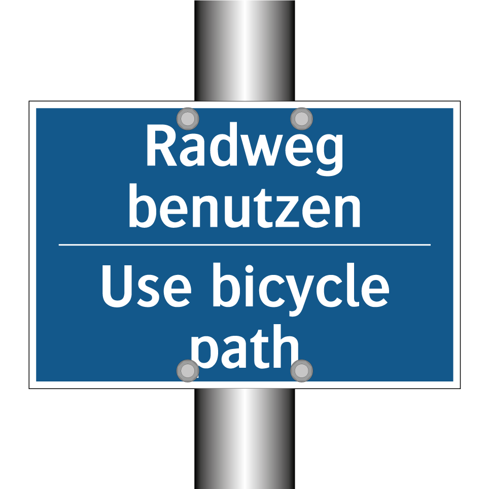 Zweisprachiges Verbotsschild mit deutschem Text Radweg benutzen und englischem Text Use bicycle path