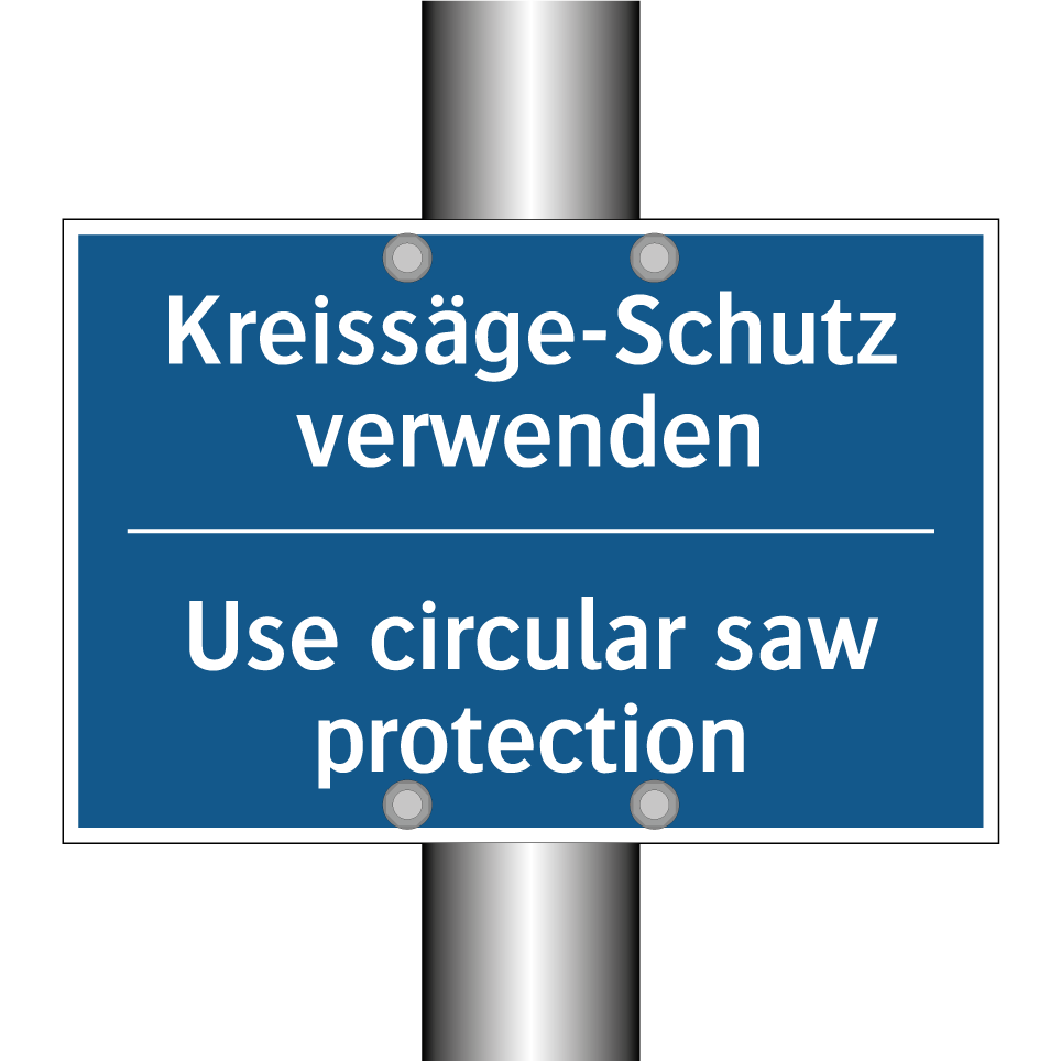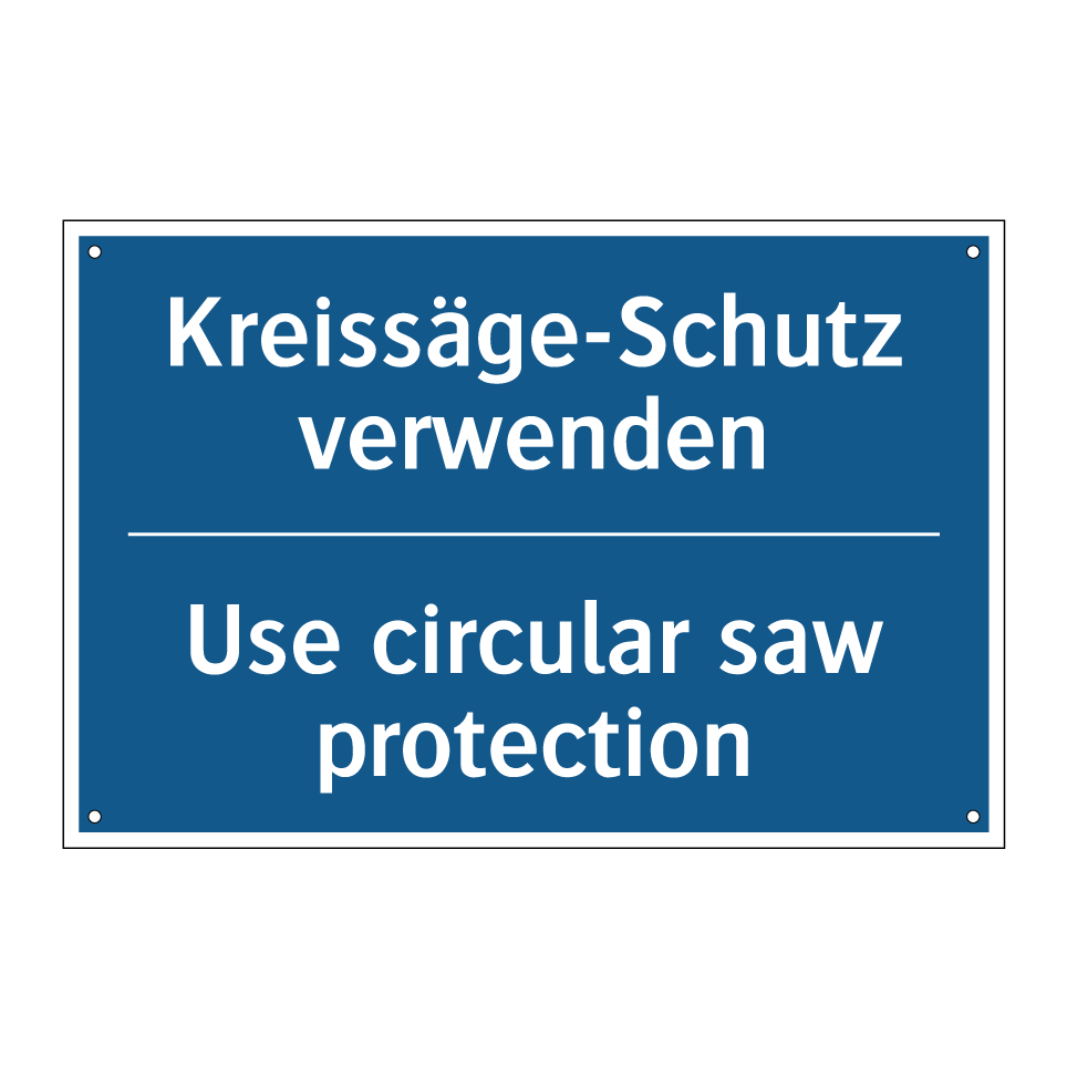 Zweisprachiges Verbotsschild mit deutschem Text Kreissäge-Schutz verwenden und englischem Text Use circular saw protection