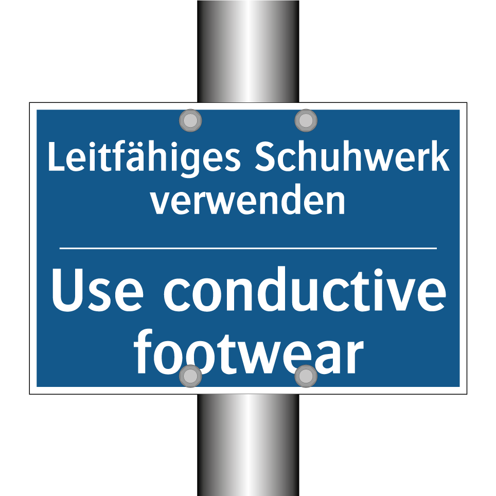 Zweisprachiges Verbotsschild mit deutschem Text Leitfähiges Schuhwerk verwenden und englischem Text Use conductive footwear