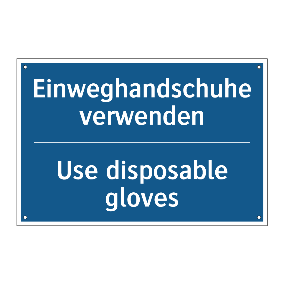 Zweisprachiges Verbotsschild mit deutschem Text Einweghandschuhe verwenden und englischem Text Use disposable gloves