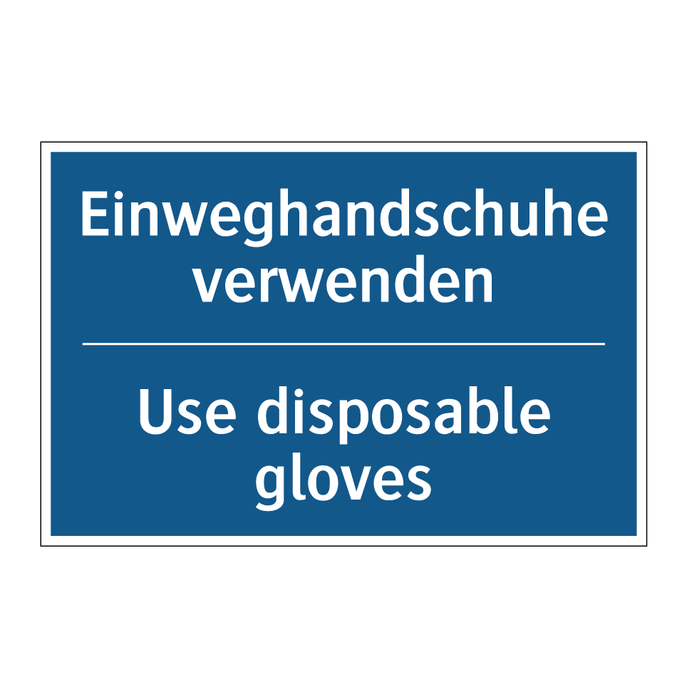 Entdecken Sie die Vielseitigkeit dieser Gebotsschild, die sowohl auf Deutsch als auch auf Englisch gestaltet ist. Diese zweisprachige Beschilderung ist ideal für internationale Umgebungen, in denen klare Kommunikation entscheidend ist. Sie dient dazu, die Verwendung von Einweghandschuhen in Bereichen wie Laboren, Krankenhäusern oder Lebensmittelverarbeitungsbetrieben zu fördern. Die auffällige blaue Hintergrundfarbe mit weißer Schrift sorgt dafür, dass die Anweisung leicht erkennbar ist. Platzieren Sie diese Gebotsschild an Eingängen, in Umkleideräumen oder an Arbeitsstationen, um die Einhaltung von Hygienestandards sicherzustellen. Die zweisprachige Gestaltung erhöht die Verständlichkeit und minimiert Missverständnisse, was zu einer sichereren und effizienteren Arbeitsumgebung beiträgt.
