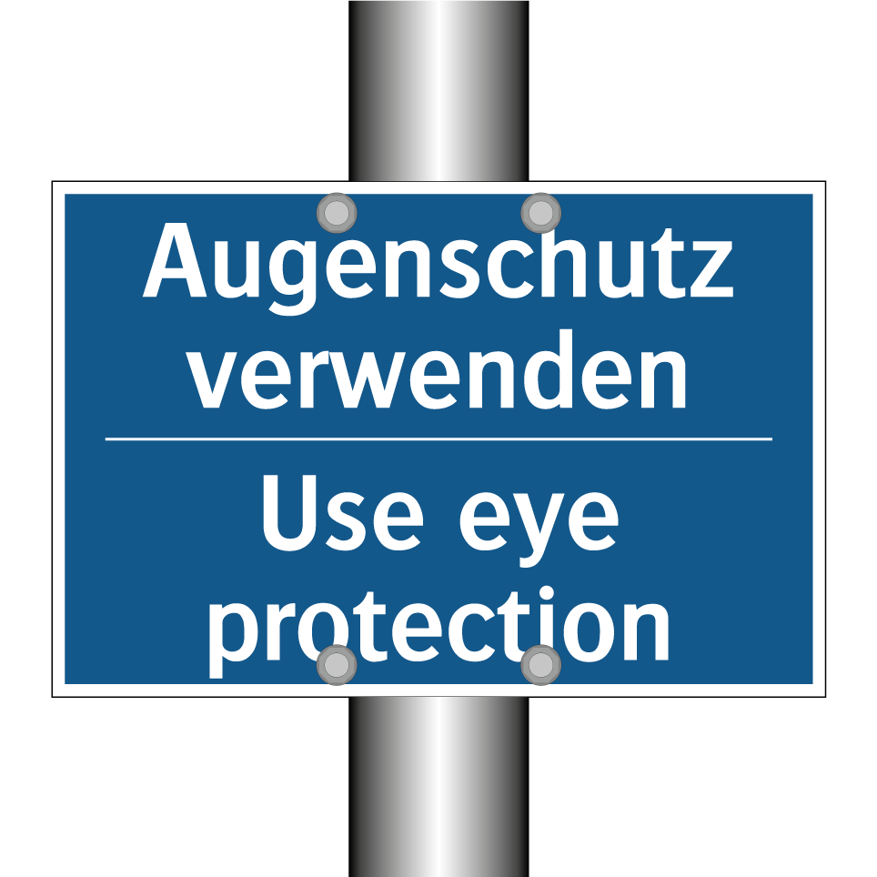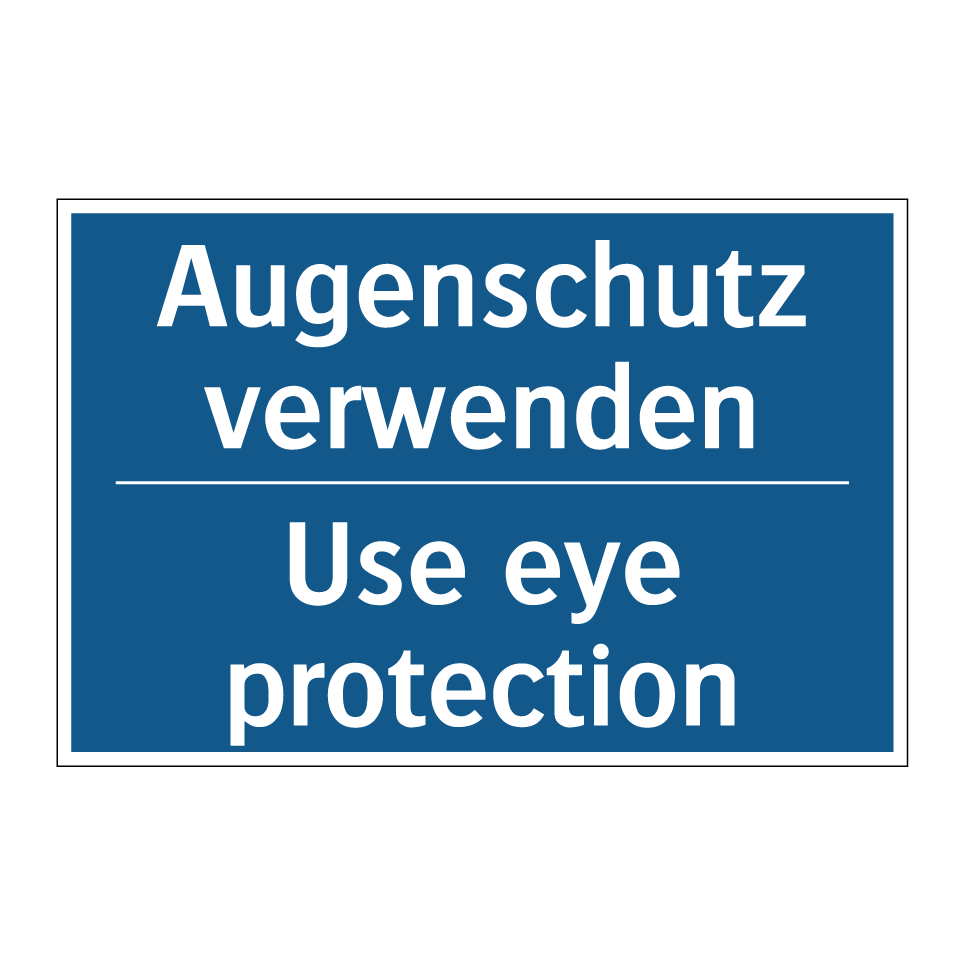 Zweisprachiges Verbotsschild mit deutschem Text Augenschutz verwenden und englischem Text Use eye protection