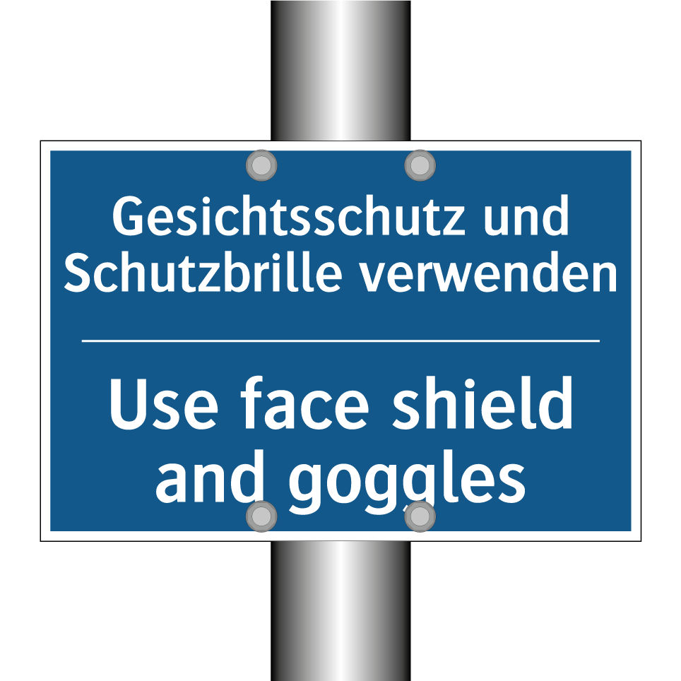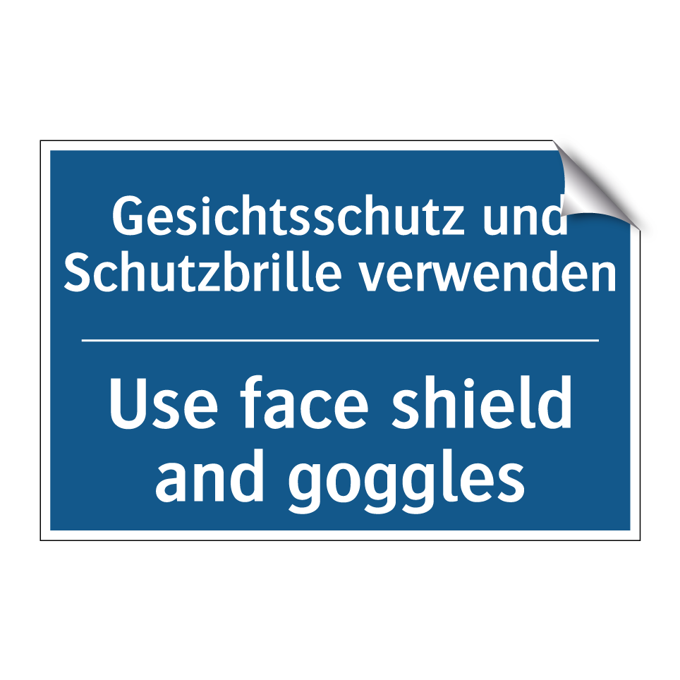 Zweisprachiges Verbotsschild mit deutschem Text Gesichtsschutz und Schutzbrille verwenden und englischem Text Use face shield and goggles