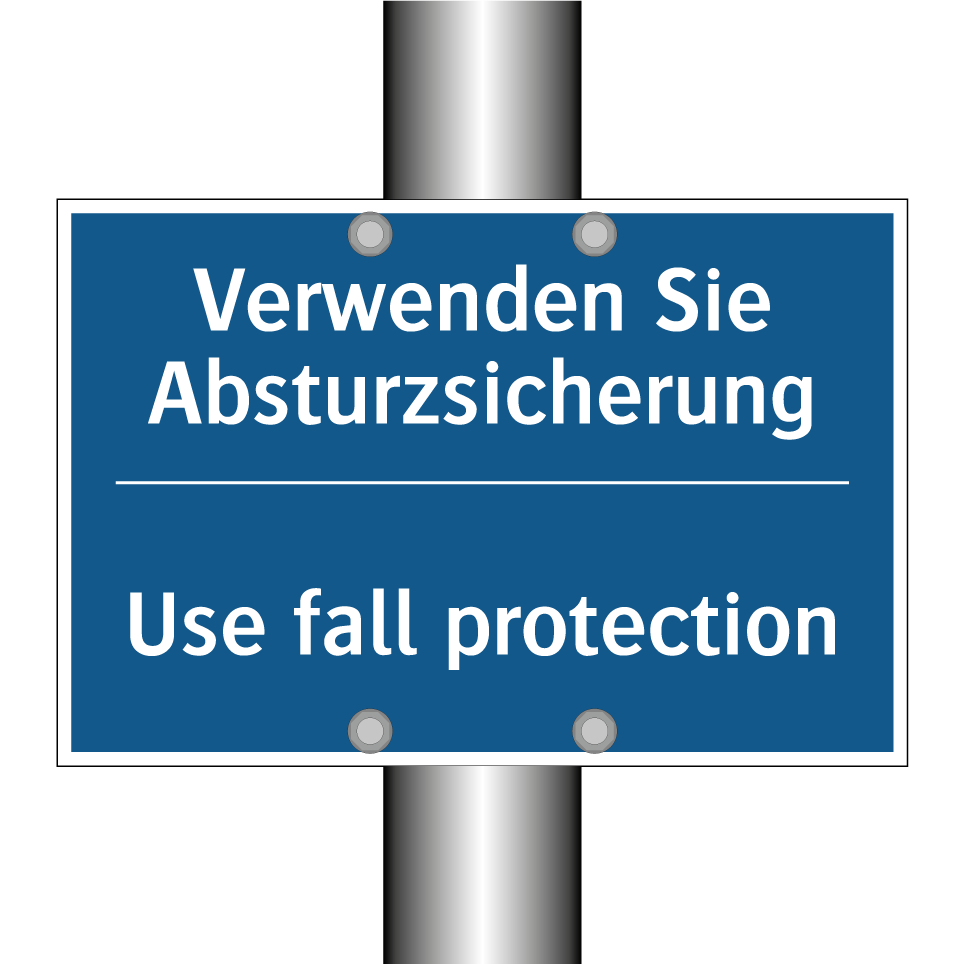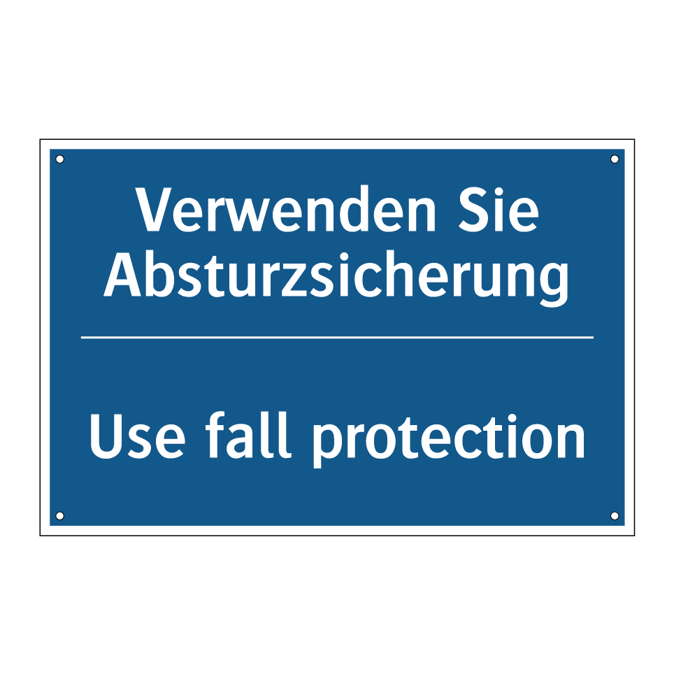 Zweisprachiges Verbotsschild mit deutschem Text Verwenden Sie Absturzsicherung und englischem Text Use fall protection