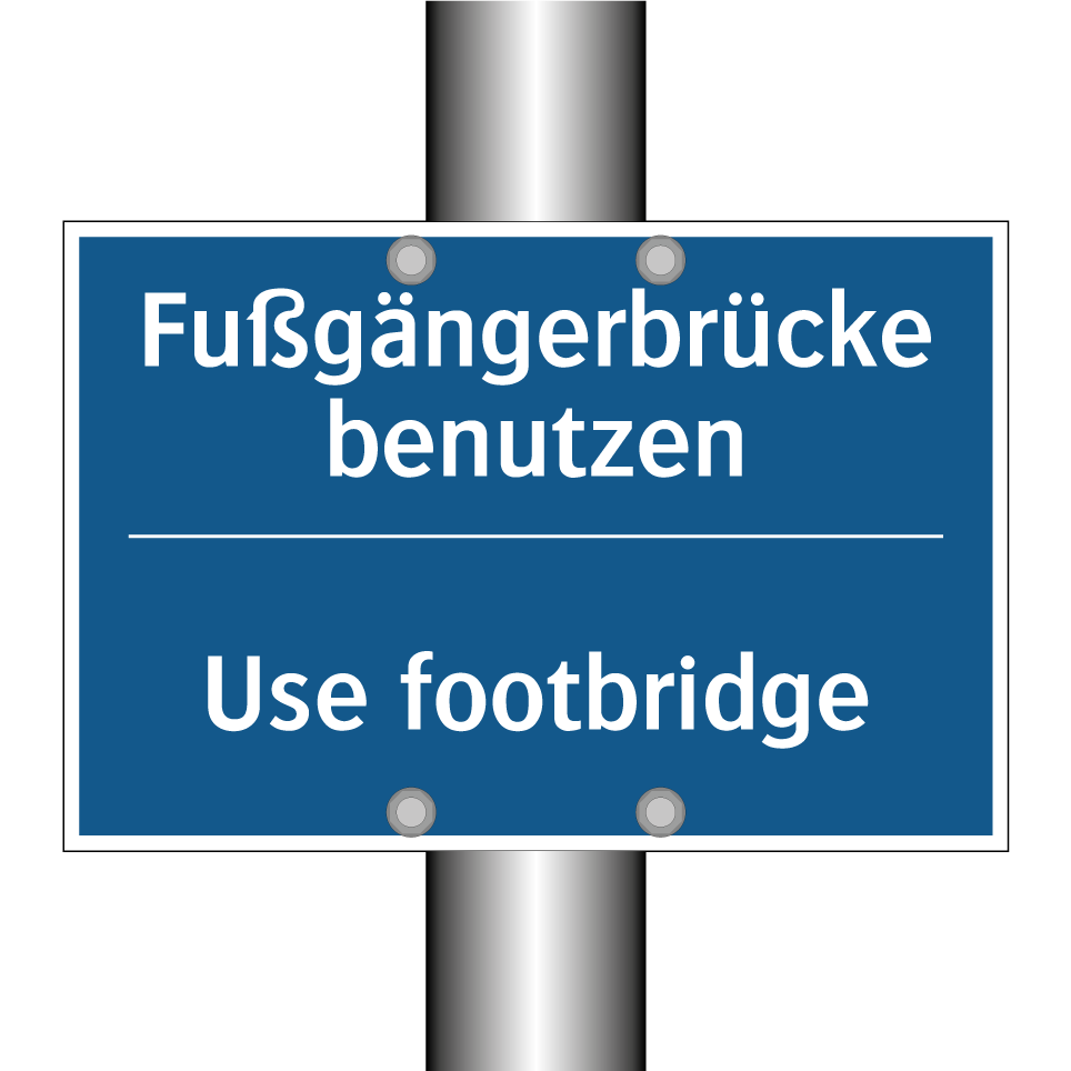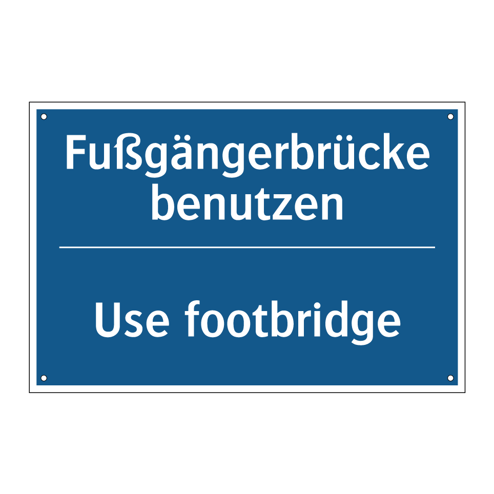 Zweisprachiges Verbotsschild mit deutschem Text Fußgängerbrücke benutzen und englischem Text Use footbridge