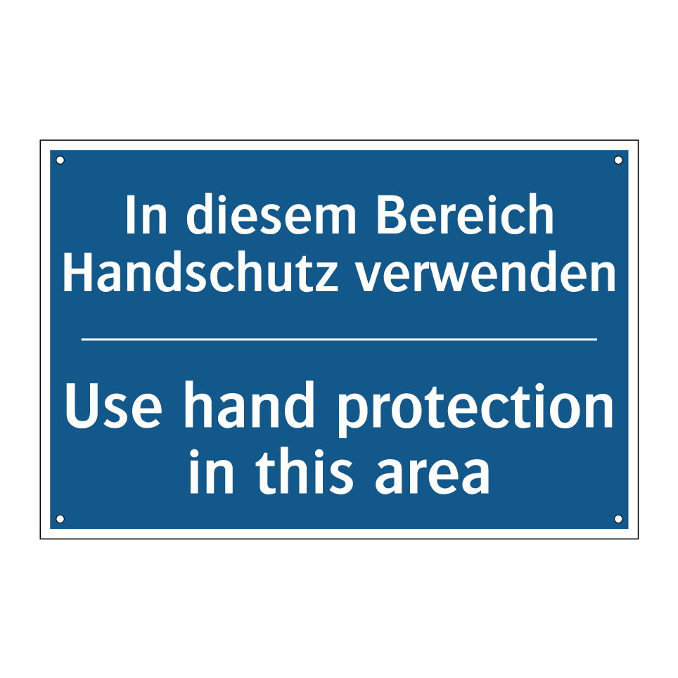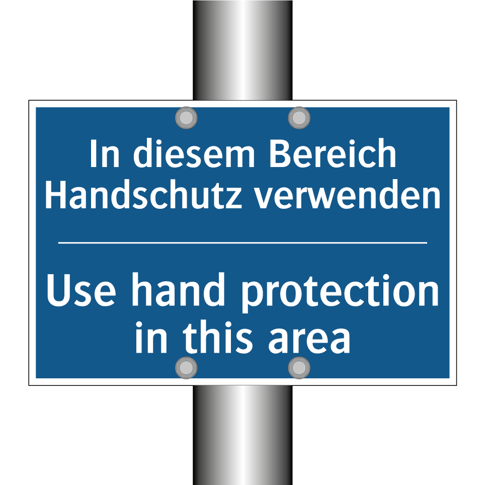 Zweisprachiges Verbotsschild mit deutschem Text In diesem Bereich Handschutz verwenden und englischem Text Use hand protection in this area