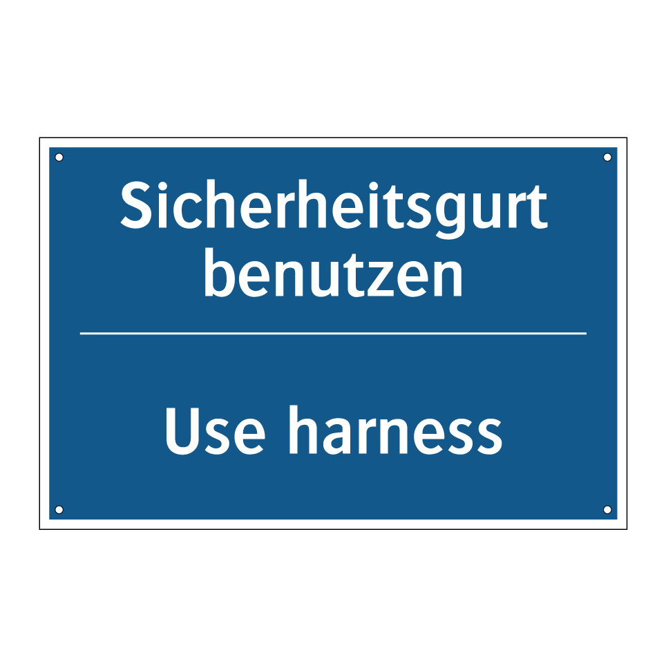 Zweisprachiges Verbotsschild mit deutschem Text Sicherheitsgurt benutzen und englischem Text Use harness