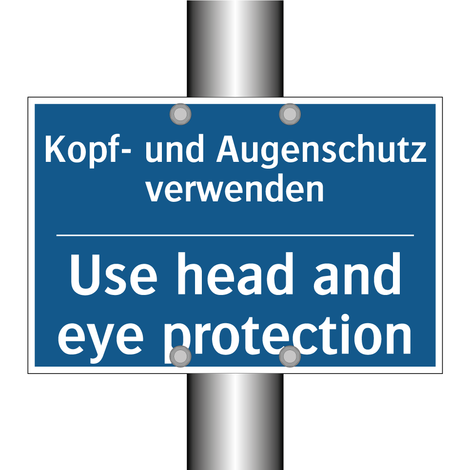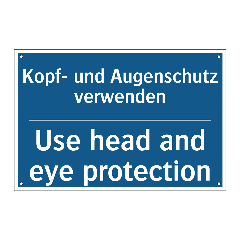 Zweisprachiges Verbotsschild mit deutschem Text Kopf- und Augenschutz verwenden und englischem Text Use head and eye protection