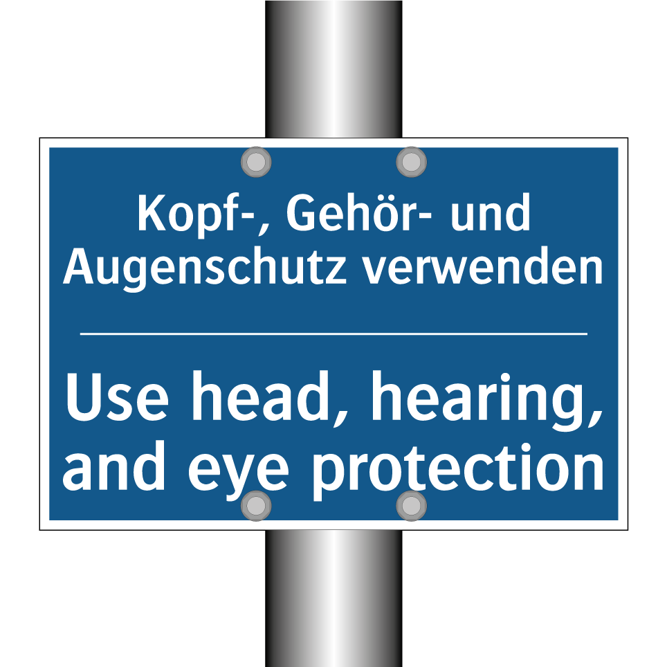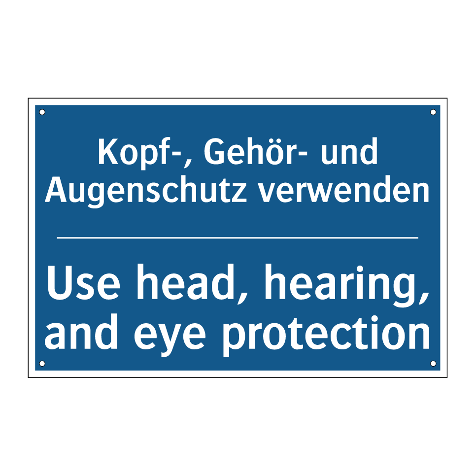 Zweisprachiges Verbotsschild mit deutschem Text Kopf-, Gehör- und Augenschutz verwenden und englischem Text Use head, hearing, and eye protection