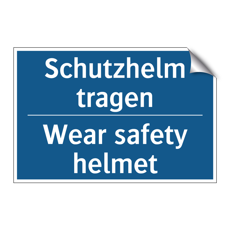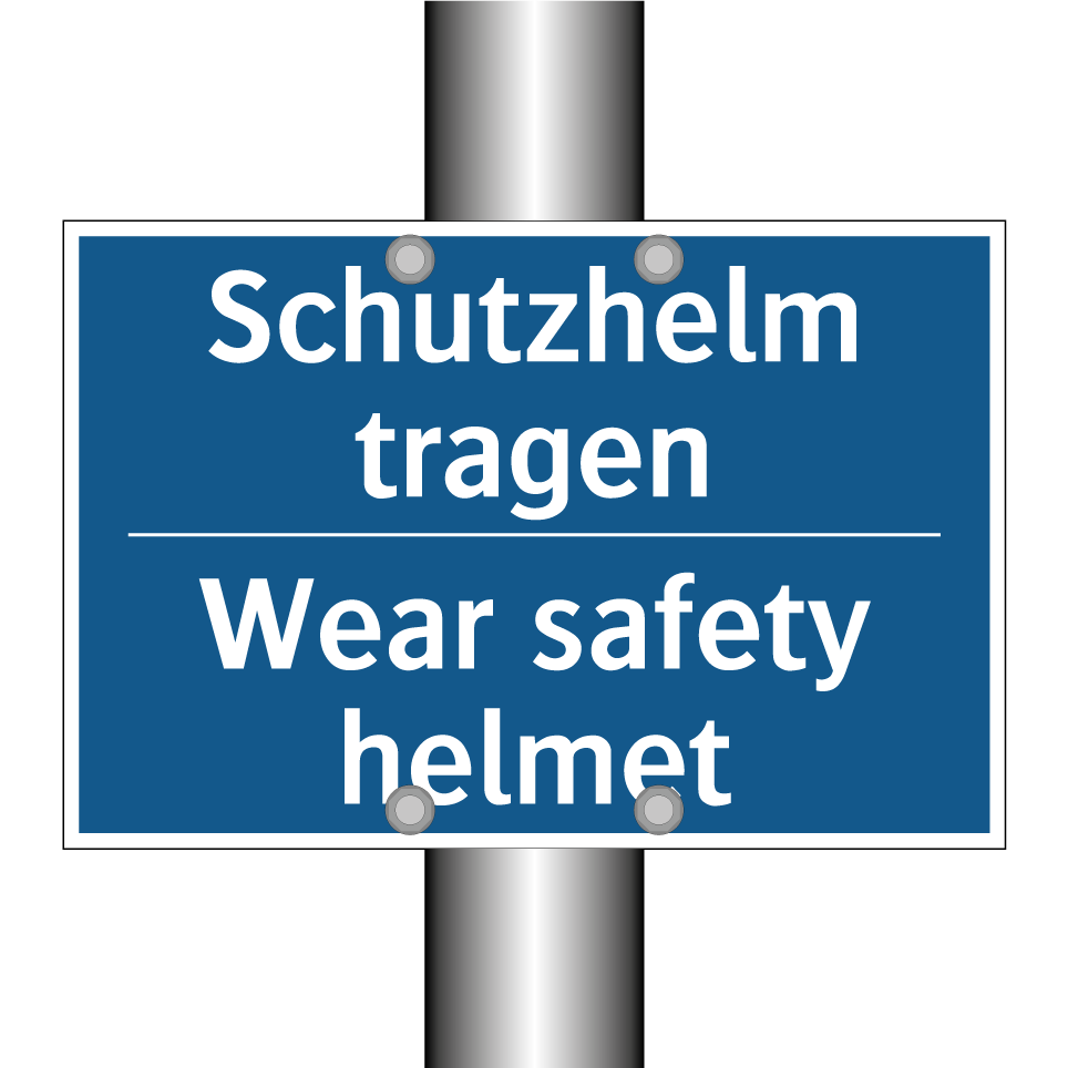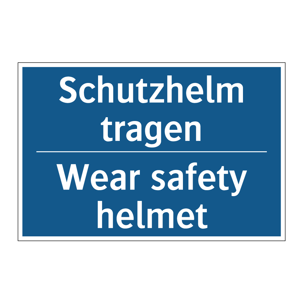 Zweisprachiges Verbotsschild mit deutschem Text Schutzhelm tragen und englischem Text Wear safety helmet