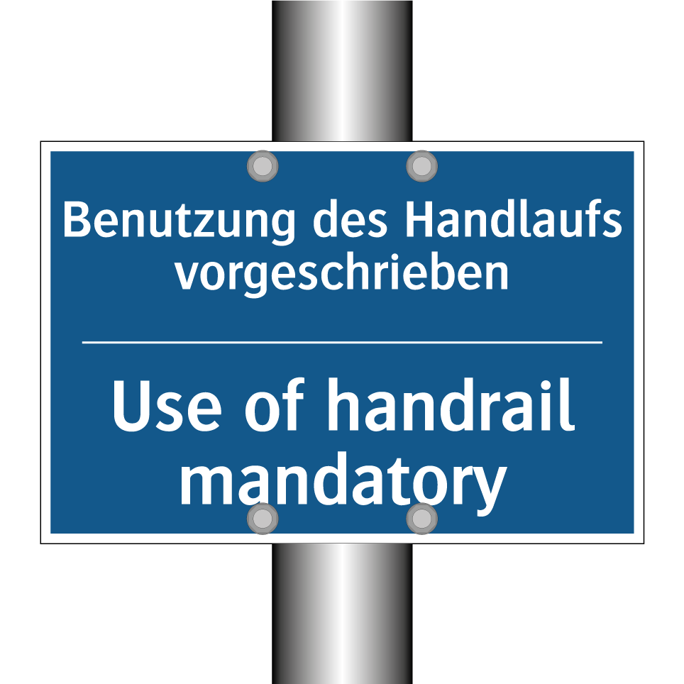 Zweisprachiges Verbotsschild mit deutschem Text Benutzung des Handlaufs vorgeschrieben und englischem Text Use of handrail mandatory