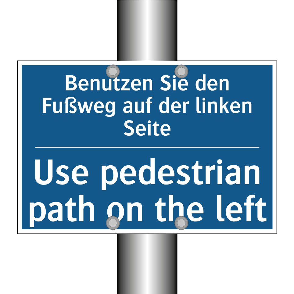 Zweisprachiges Verbotsschild mit deutschem Text Benutzen Sie den Fußweg auf der linken Seite und englischem Text Use pedestrian path on the left