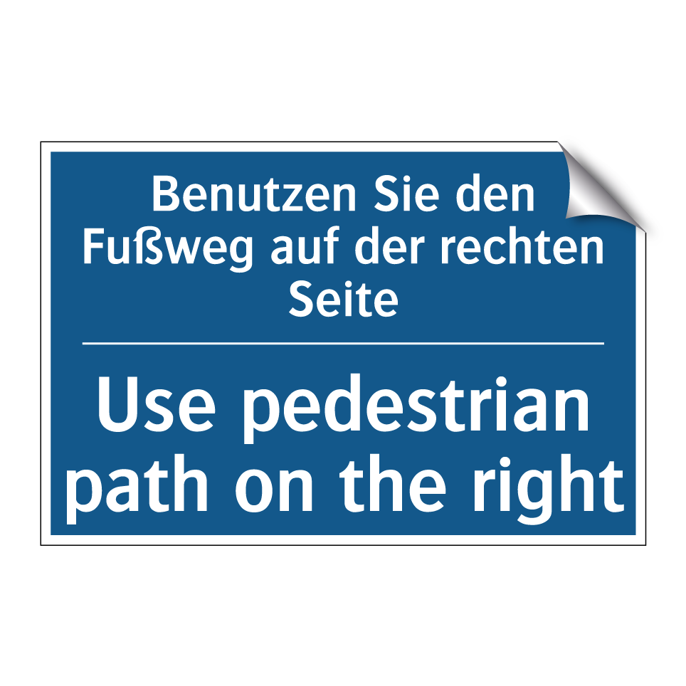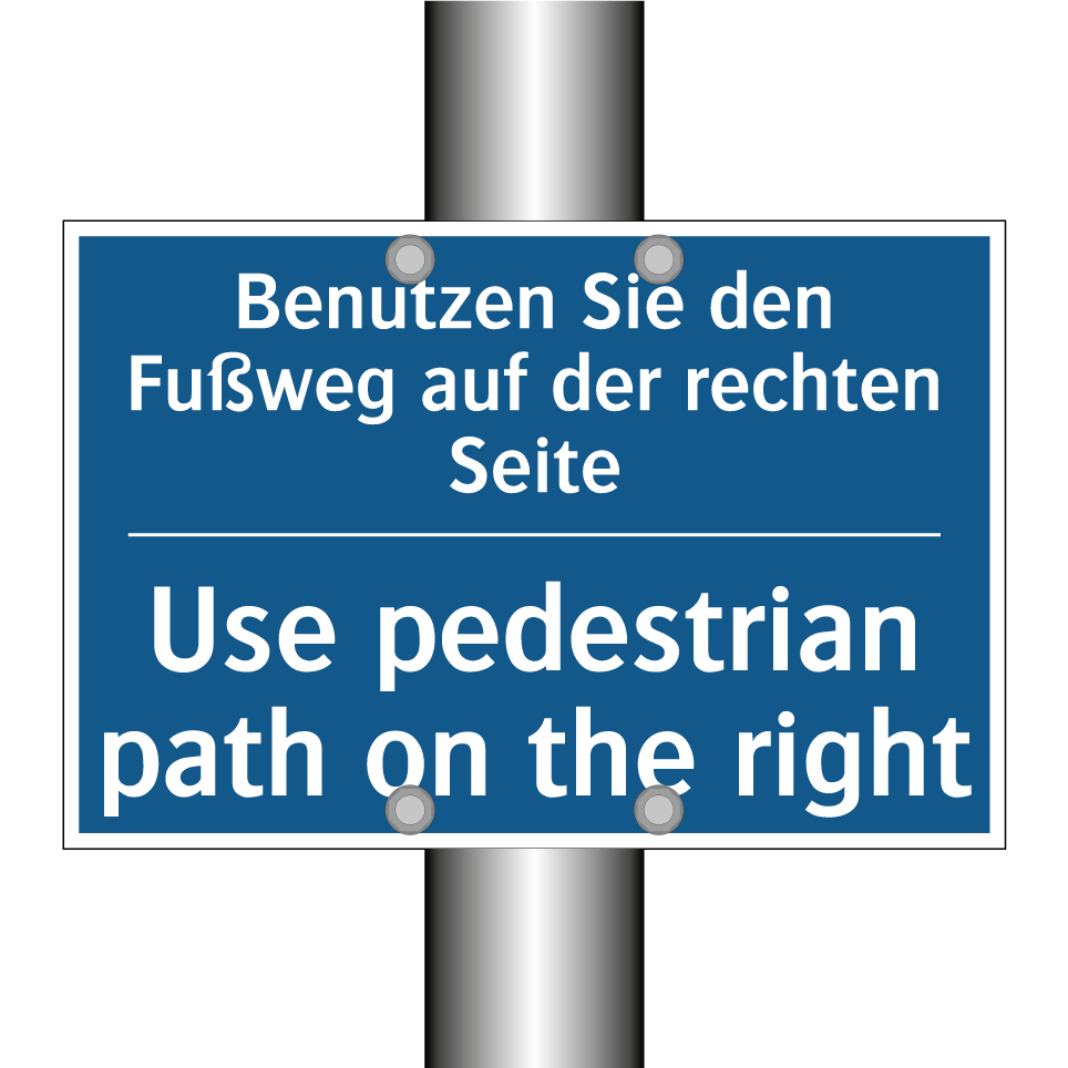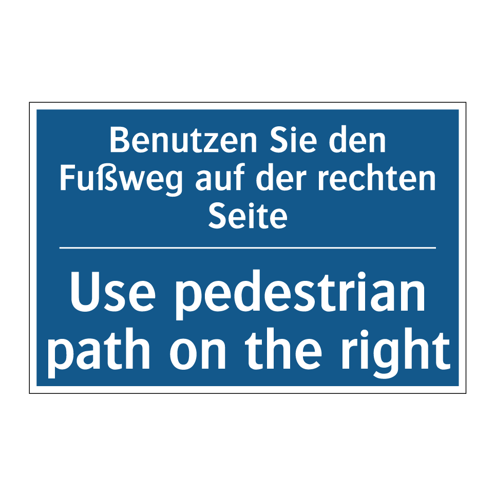 Zweisprachiges Verbotsschild mit deutschem Text Benutzen Sie den Fußweg auf der rechten Seite und englischem Text Use pedestrian path on the right