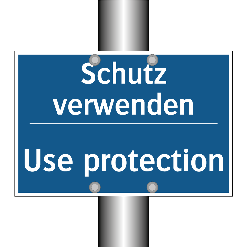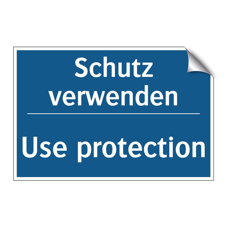 Zweisprachiges Verbotsschild mit deutschem Text Schutz verwenden und englischem Text Use protection