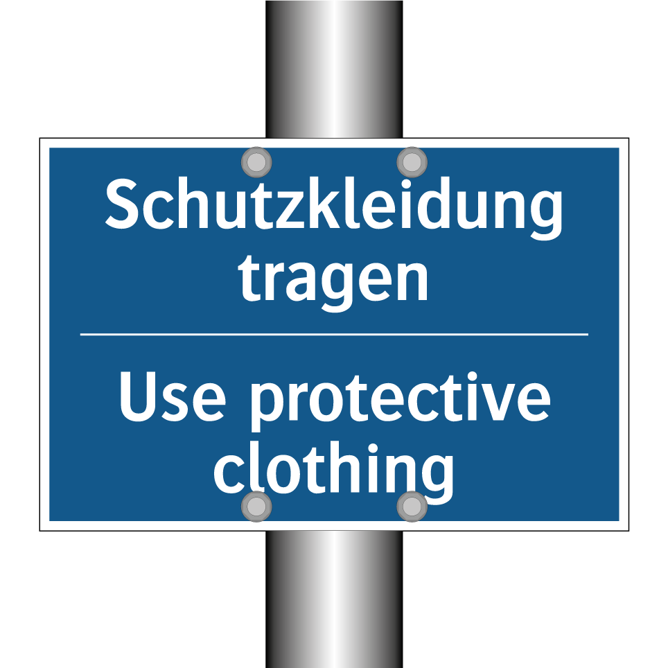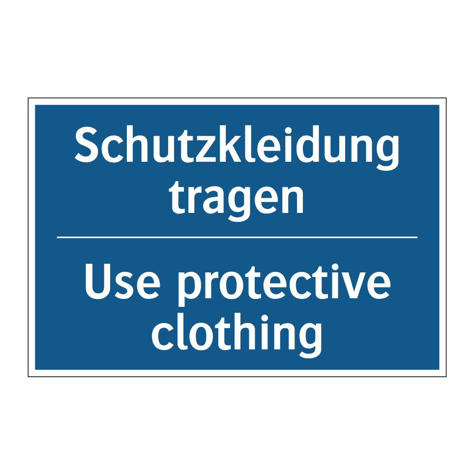 Zweisprachiges Verbotsschild mit deutschem Text Schutzkleidung tragen und englischem Text Use protective clothing