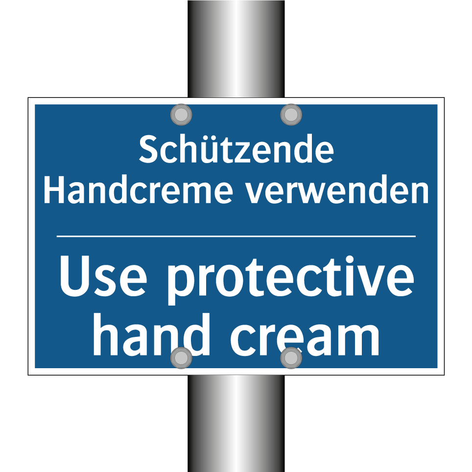Zweisprachiges Verbotsschild mit deutschem Text Schützende Handcreme verwenden und englischem Text Use protective hand cream