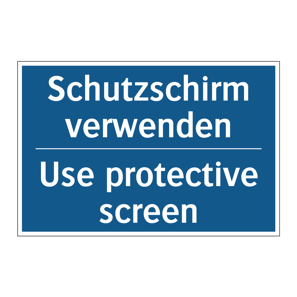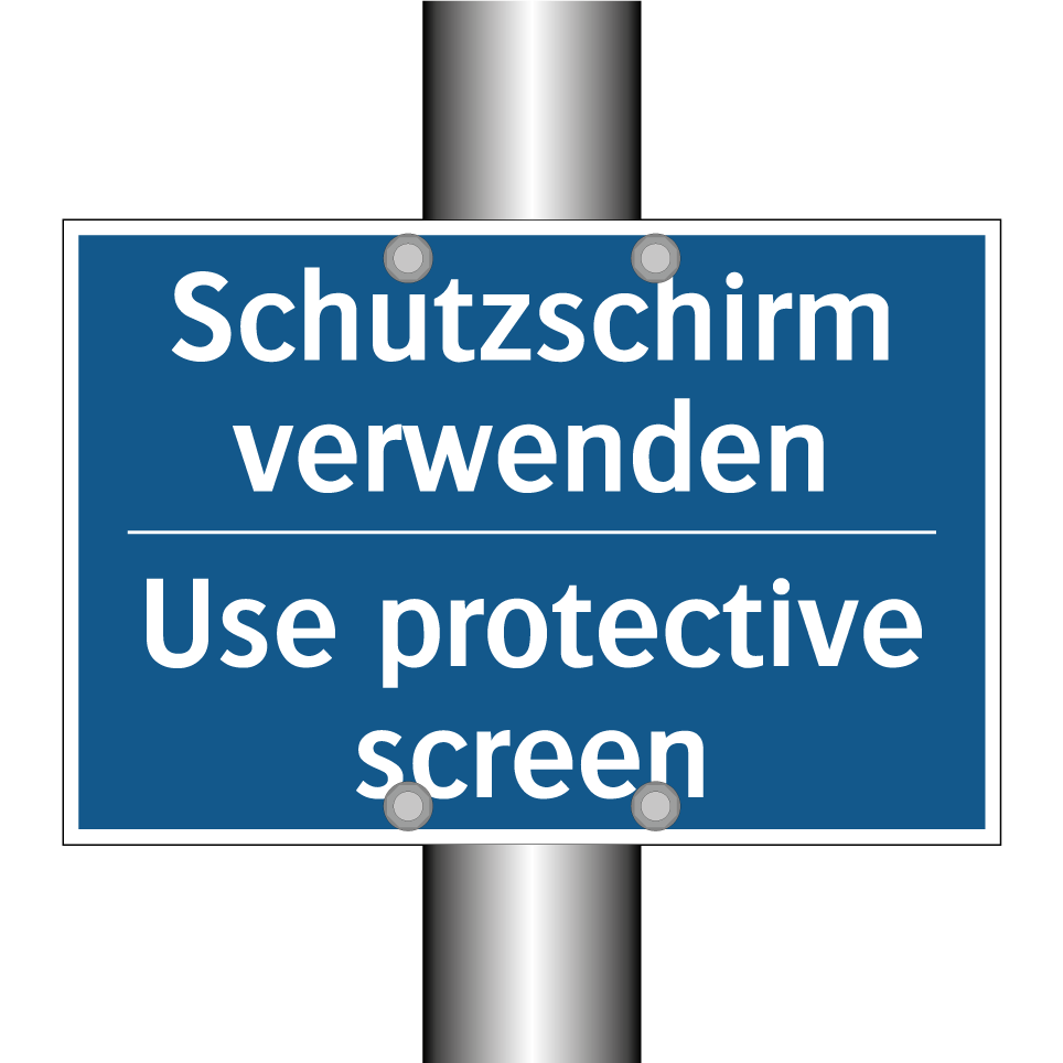 Zweisprachiges Verbotsschild mit deutschem Text Schutzschirm verwenden und englischem Text Use protective screen